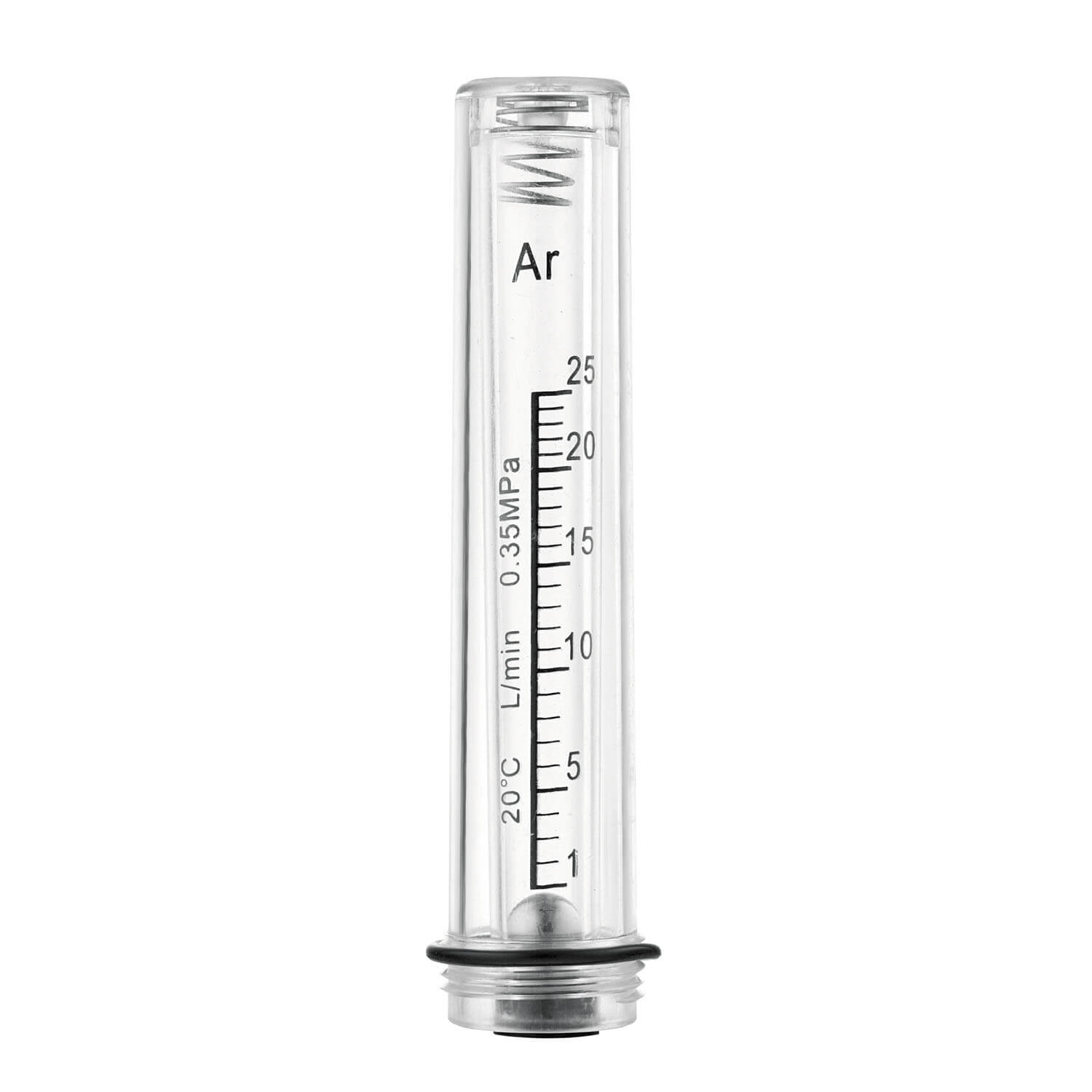 Колба выполнена из прозрачного пластика, по нижнему краю расположена резьба М22х1,5 для подсоединения к MIXER 2Р. Внутри наружной колбы, размещена малая пластиковая колба для шарика-поплавка. На ней нанесена шкала расхода аргона, которая показывает расход газа. Диапазон измерений от 1 до 25.