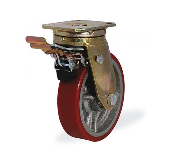 Колесо большегрузное поворотное KAMA 250 мм чугунное/полиуретан с тормозом