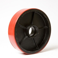 Колесо изготовлено из полиуретана красного цвета с ободом из литого металла и отличается следующими характеристиками: