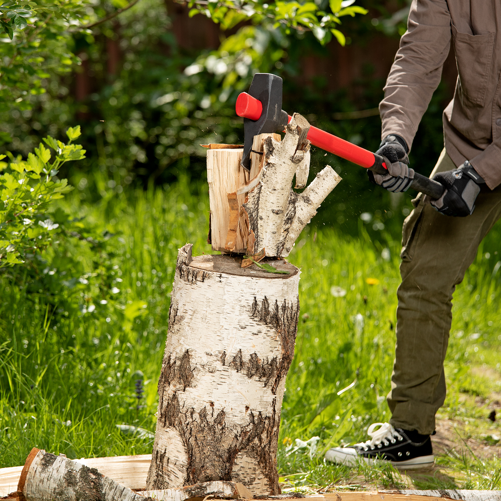 - Большая сила удара — колун оснащен длинной рукояткой 900 мм, полотно весит 3,6 кг.