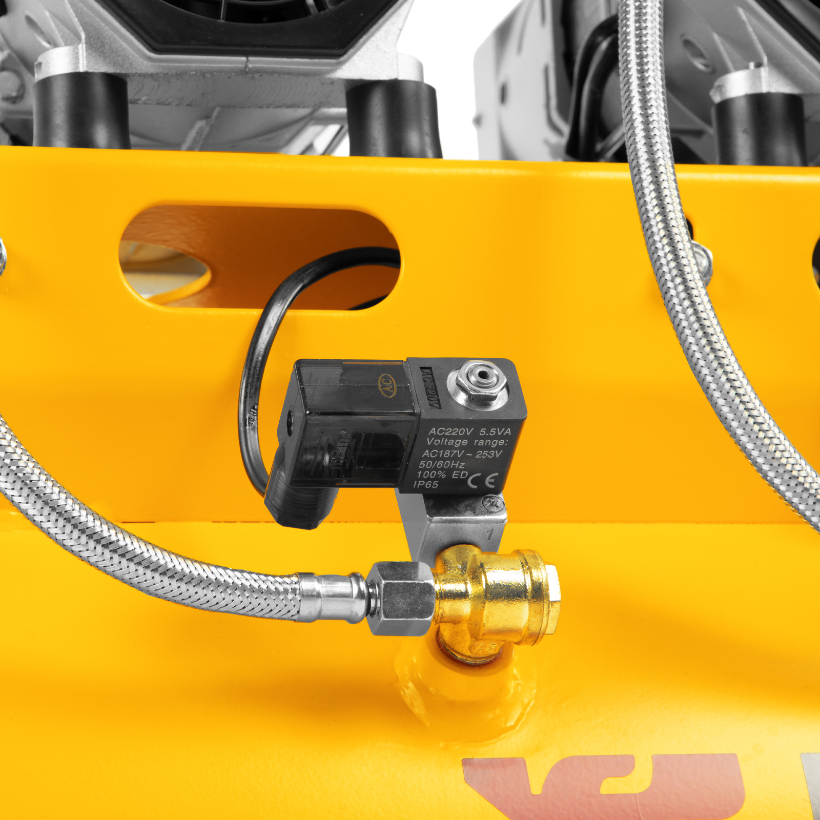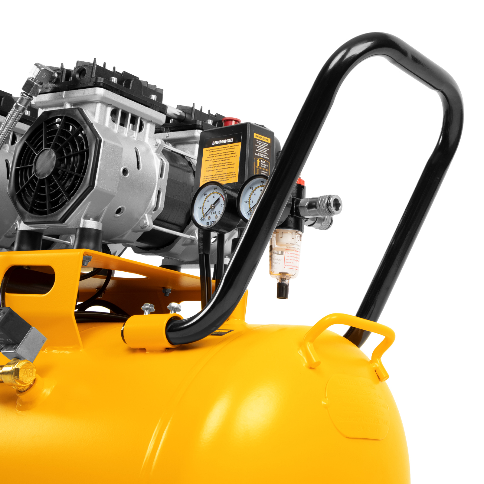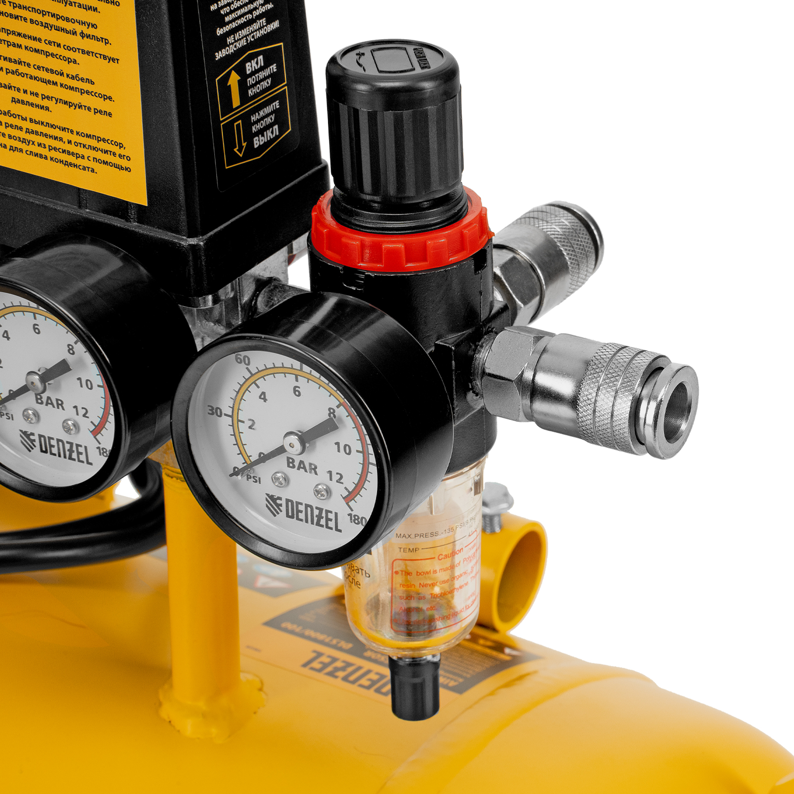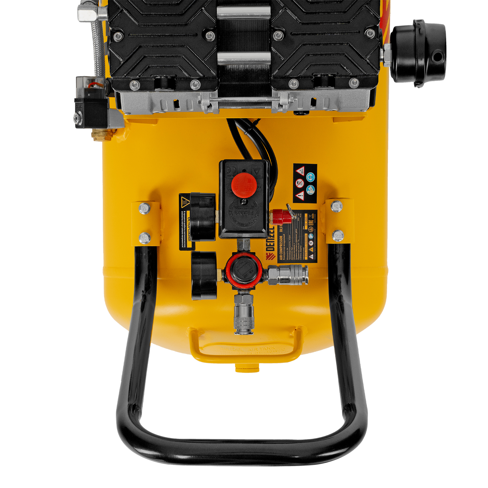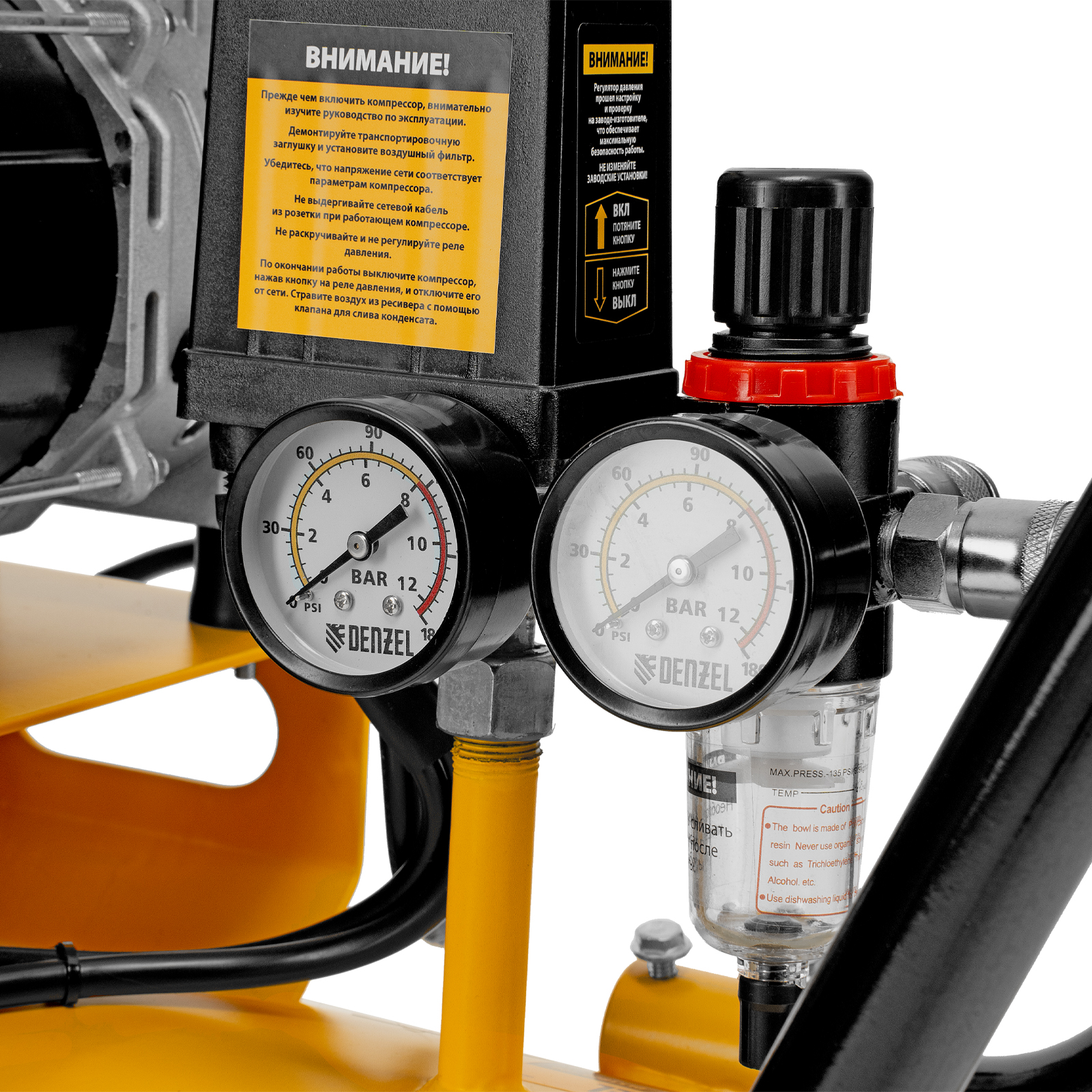 - Контроль давления в ресивере и на выходной магистрали — компрессор оборудован двумя манометрами.