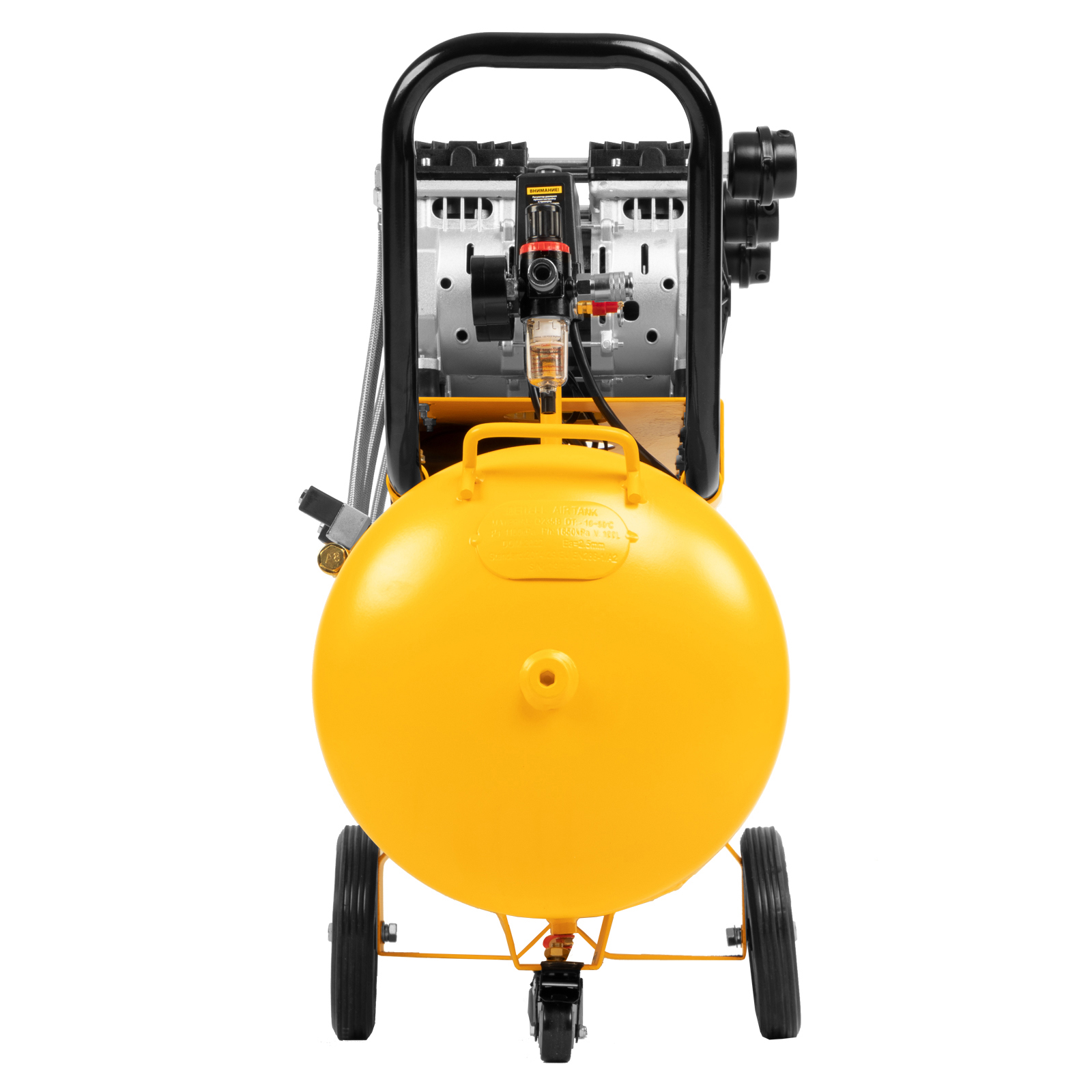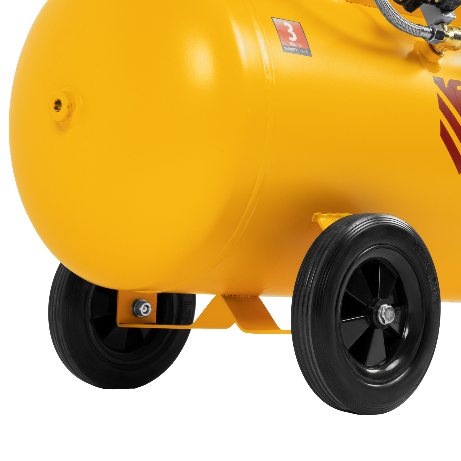 - Мобильность — компрессор оборудован ручкой и 3 колесами (из них 1 поворотное) для удобного разворота и перемещения.