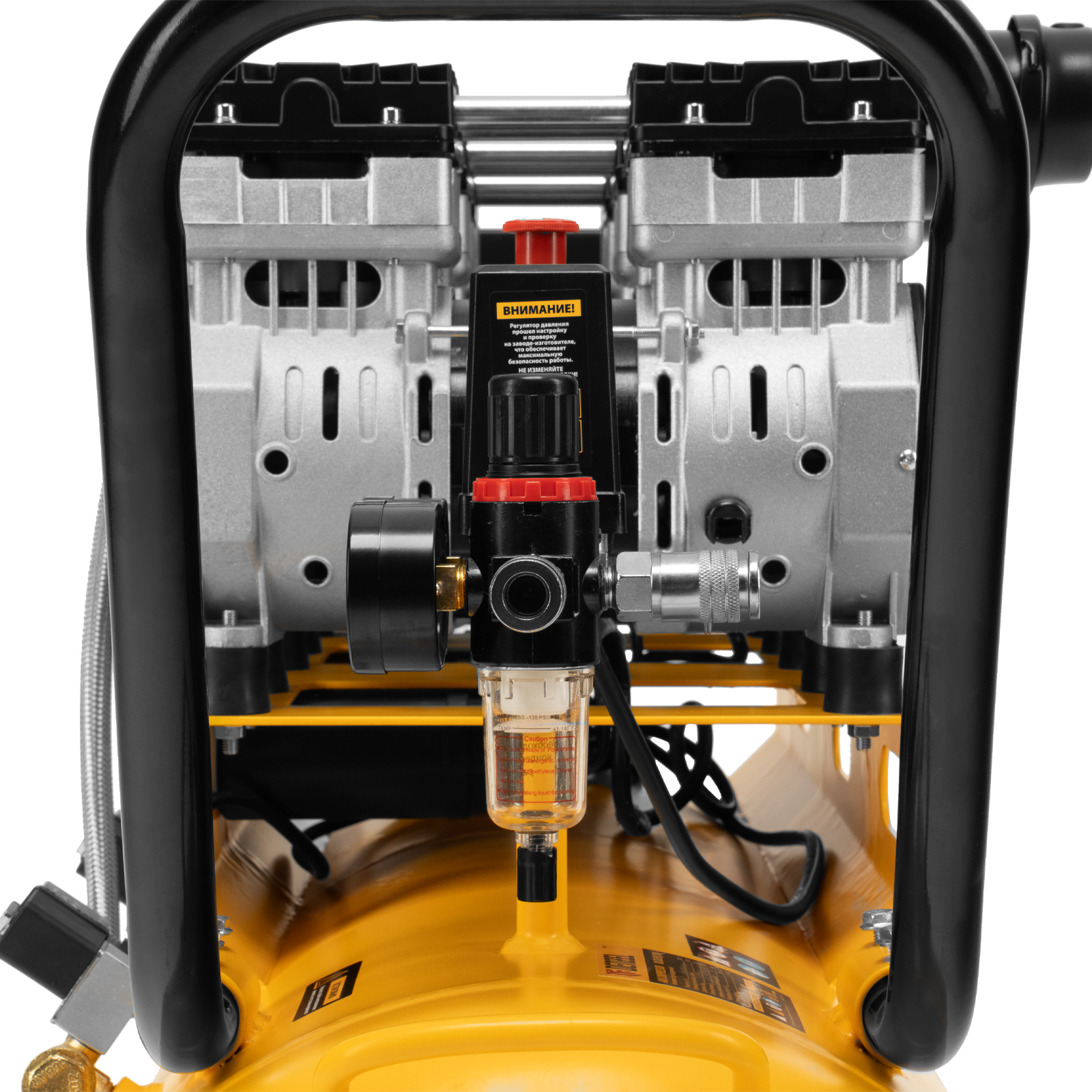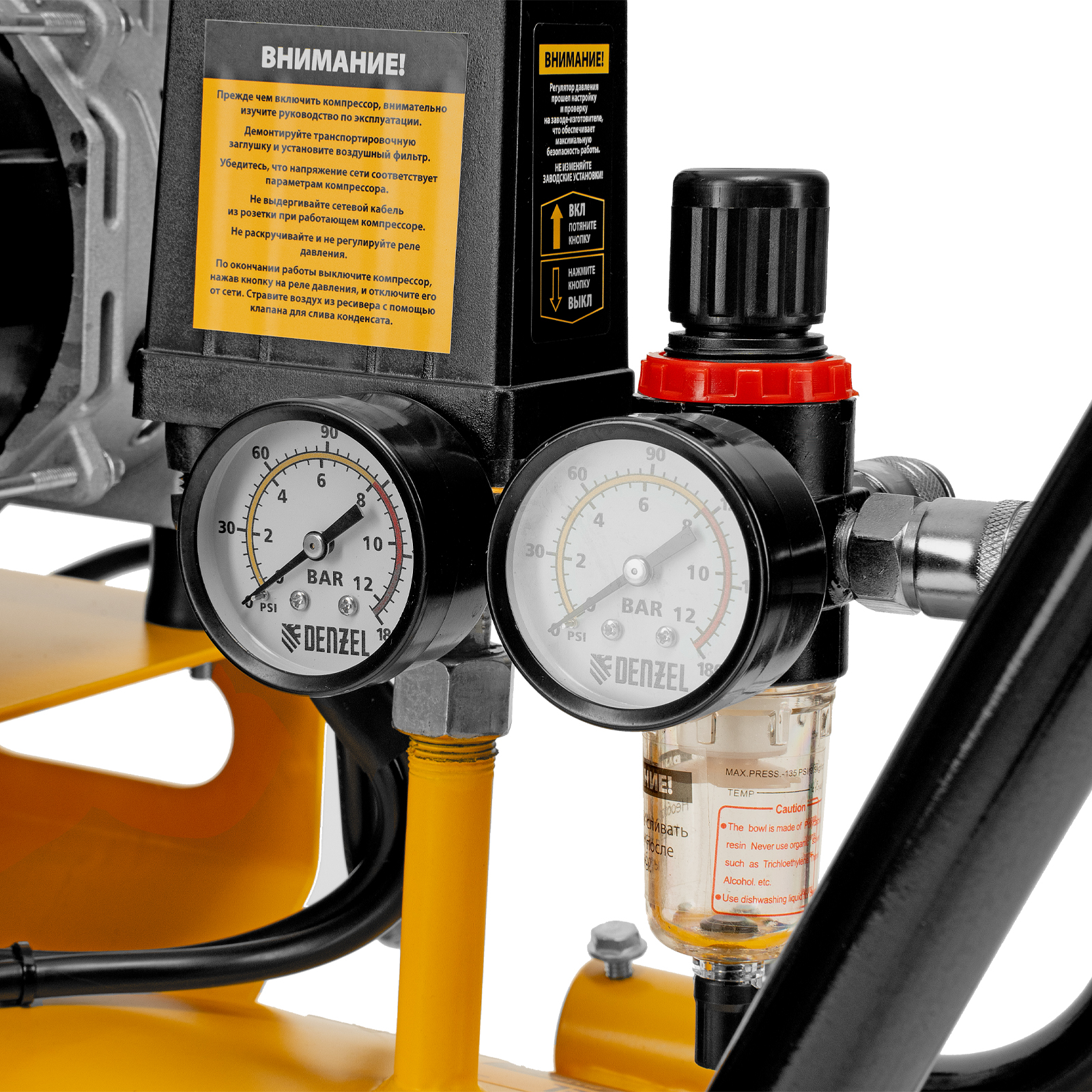 - Контроль давления в ресивере и на выходной магистрали — компрессор оборудован двумя манометрами.