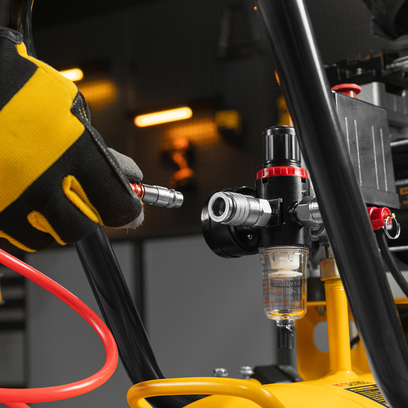 - Простая подготовка к работе — благодаря быстросъемному выходному коннектору подключение пневмоинструмента занимает несколько секунд.