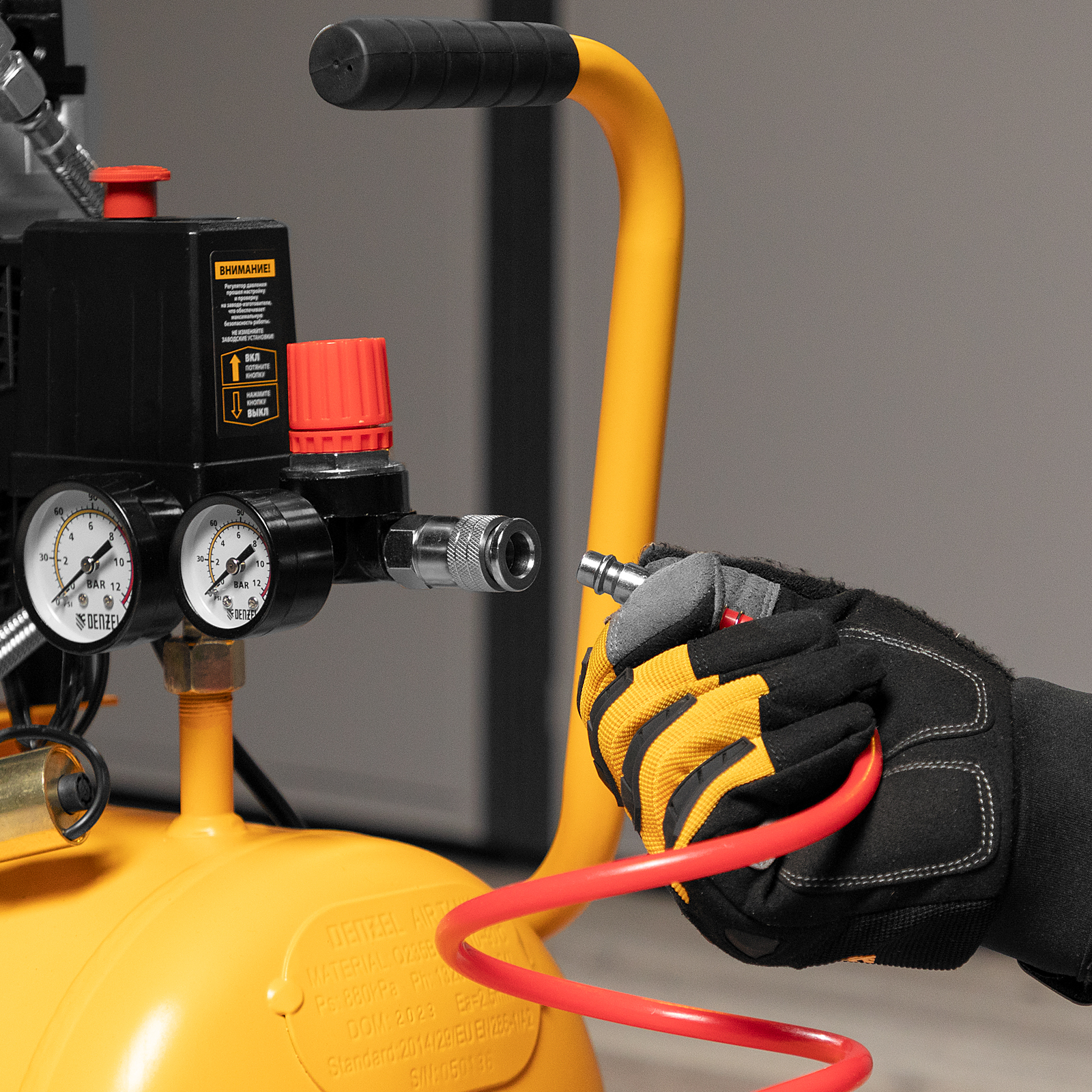 - Комфортно отслеживать параметры работы — 2 манометра позволяют контролировать давление в ресивере и пневмомагистрали, и при необходимости корректировать его.