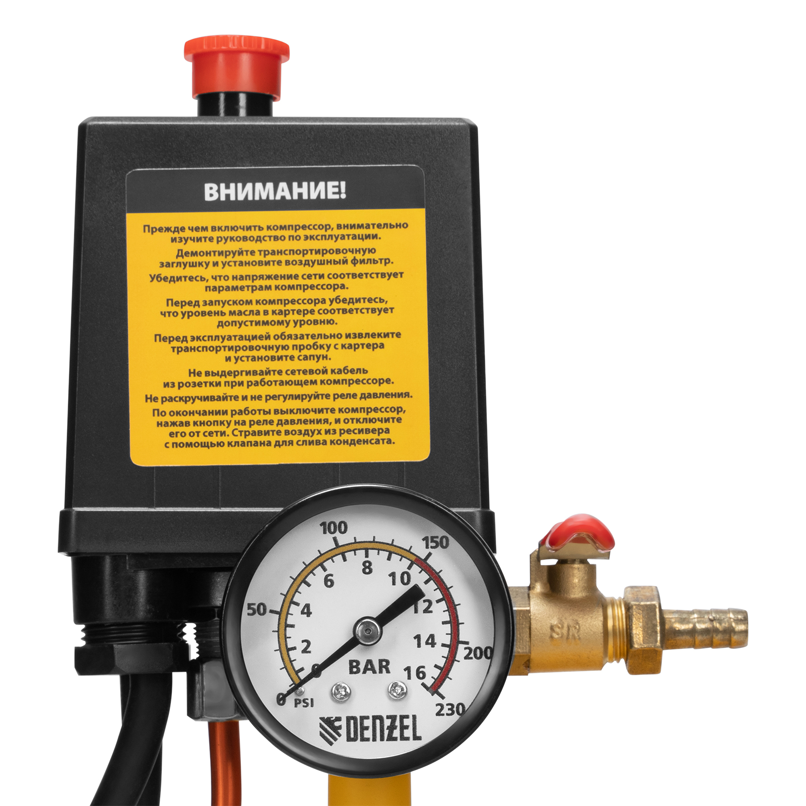 - Клапан сброса давления — если реле не сработает при давлении выше 10 бар, избыточный воздух автоматически сбросится, эта система служит дополнительной подстраховкой и гарантирует безопасность работы.