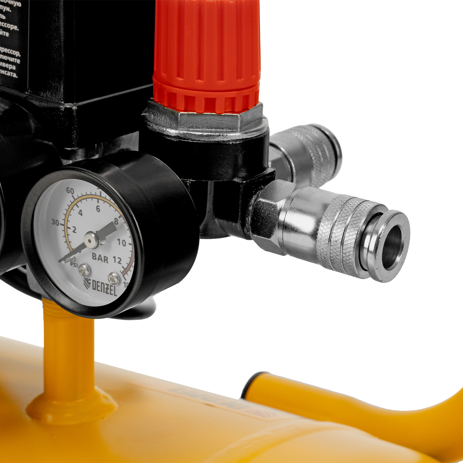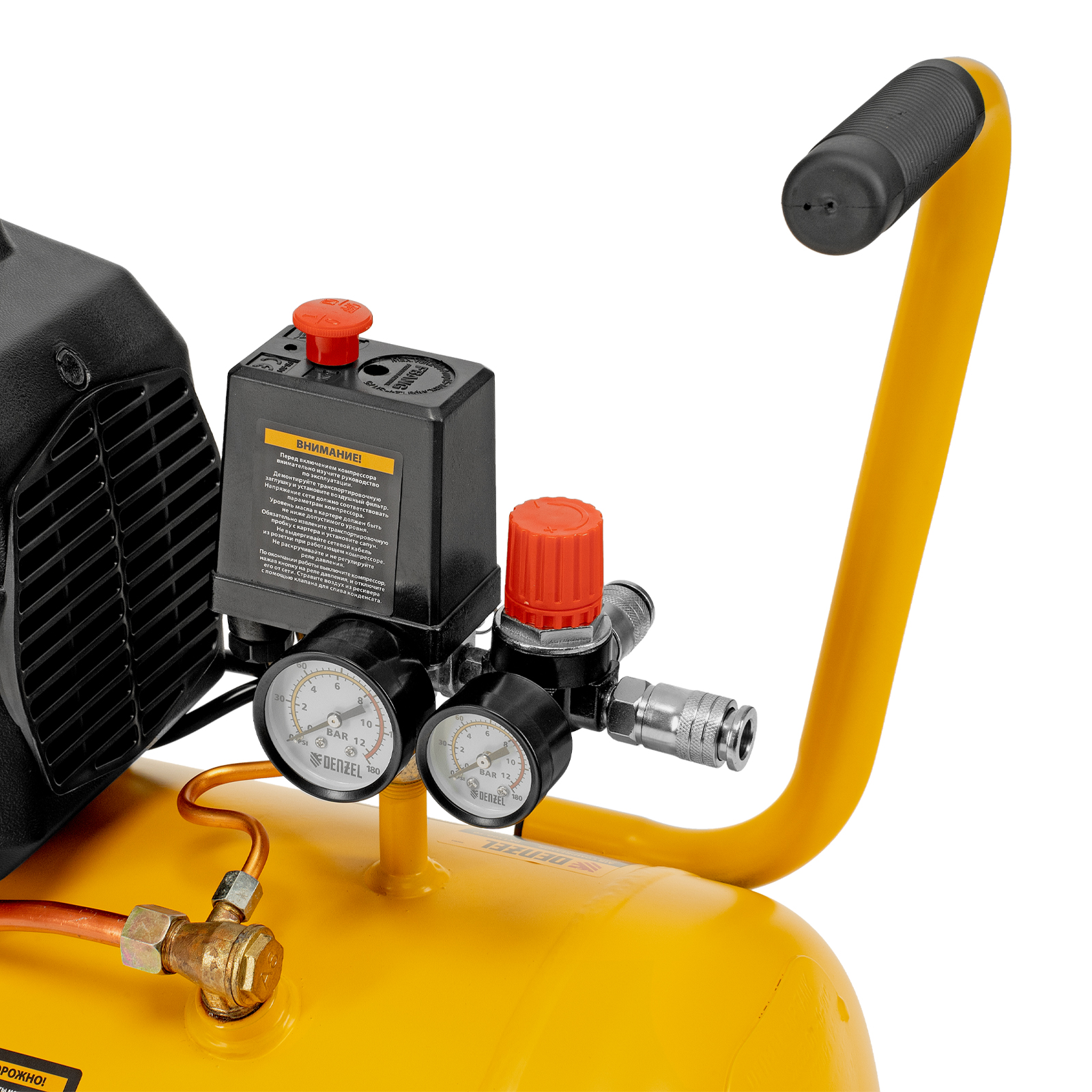 - Контроль рабочих параметров — два манометра отображают давление в ресивере и выходной магистрали.