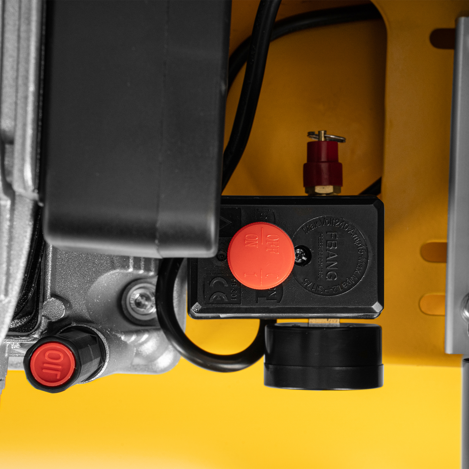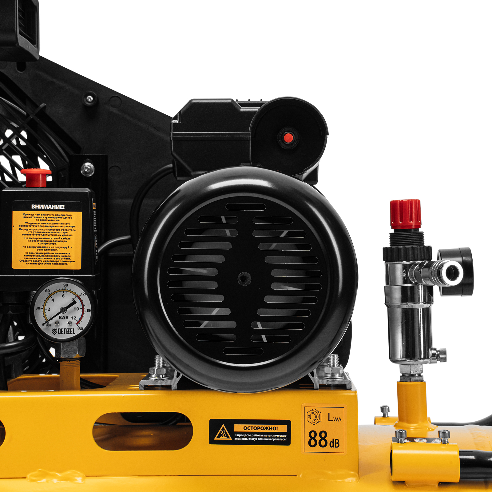 - Безопасность — в случае превышения максимально допустимого давления в ресивере срабатывает предохранительный клапан.
