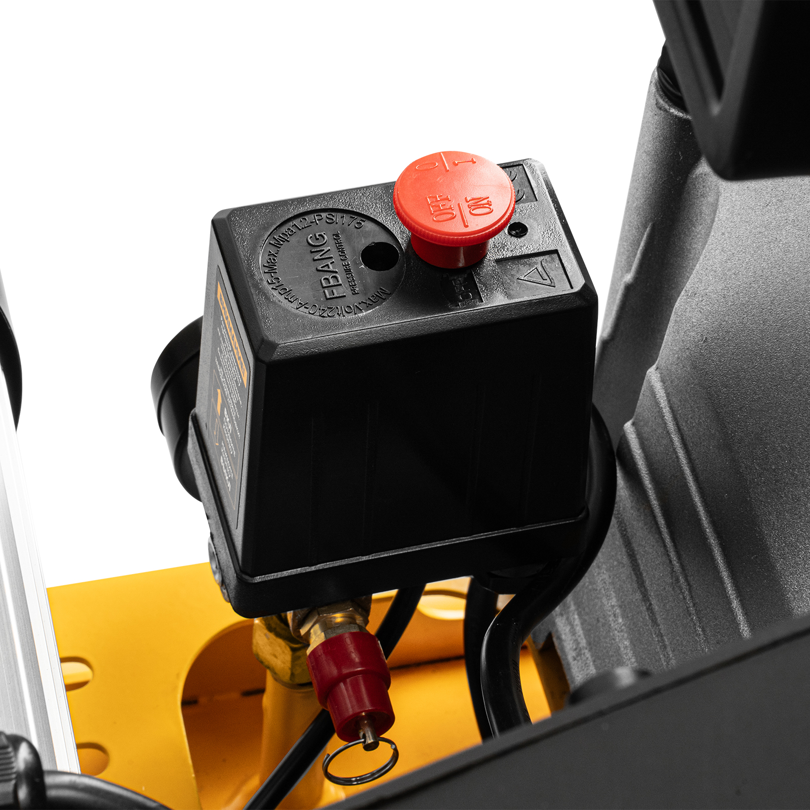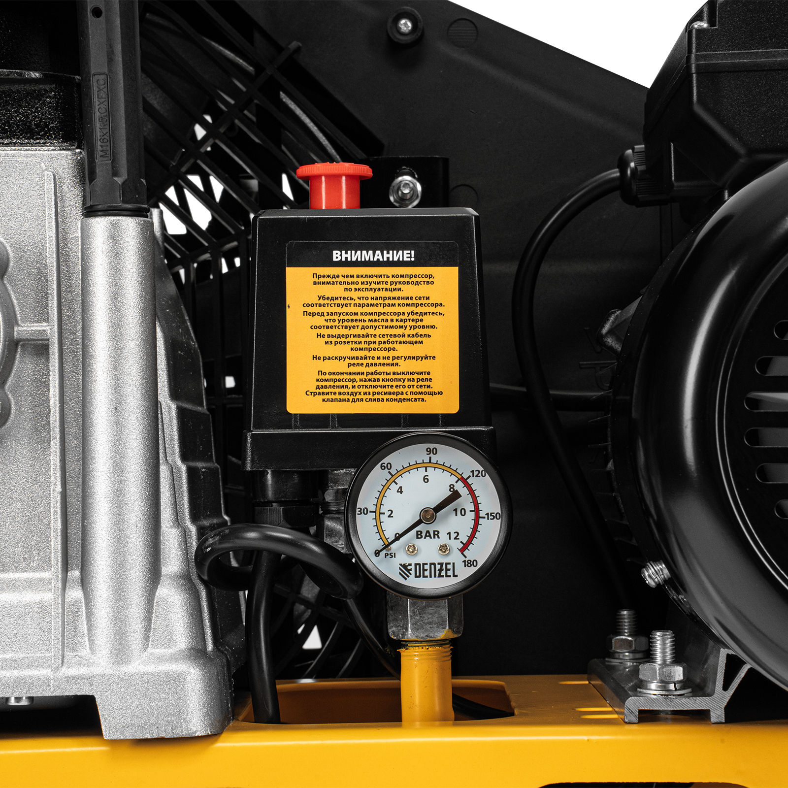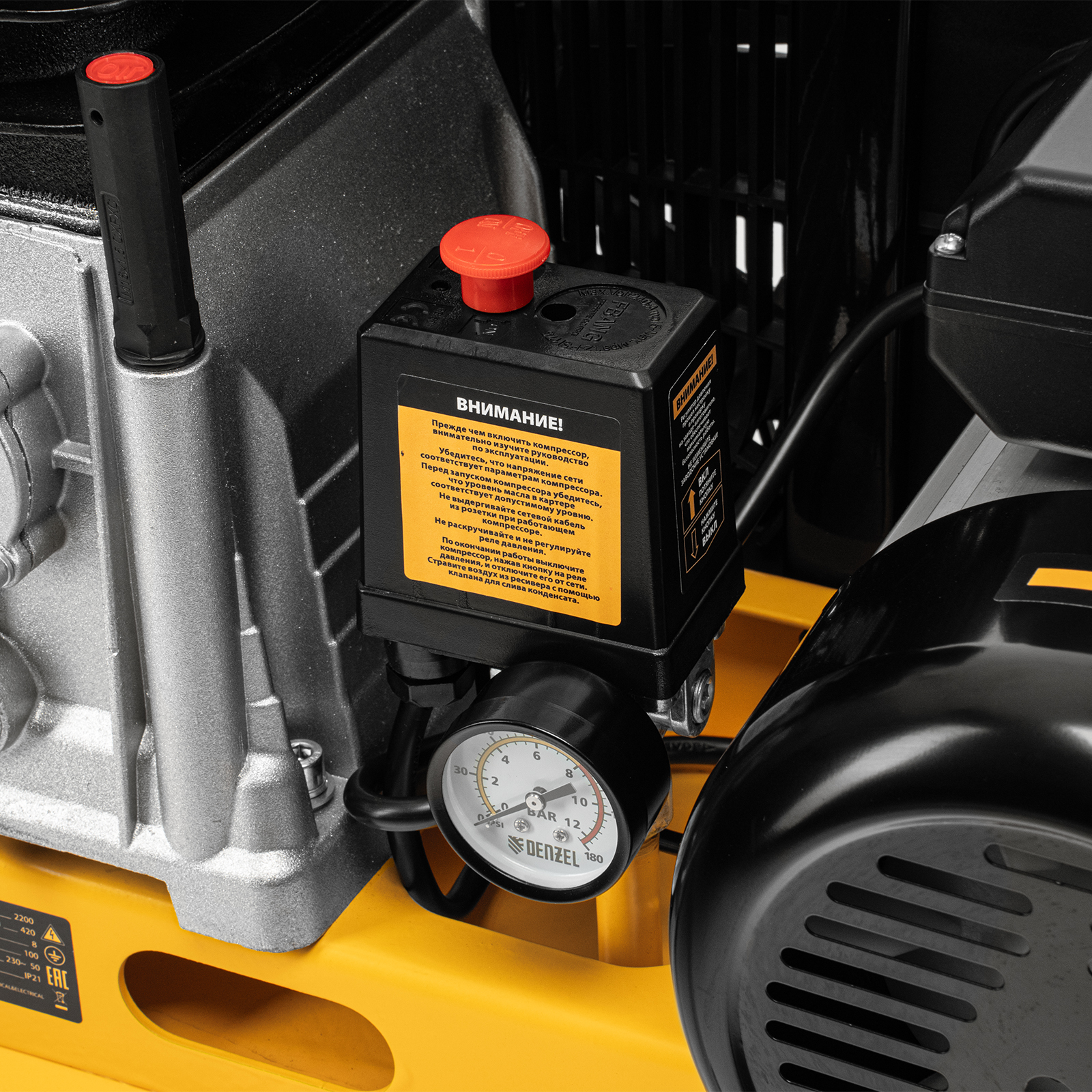 - Автономная работа — прессостат останавливает компрессор по достижении максимального рабочего давления 8 бар и запускает его, если давление падает ниже допустимого уровня.