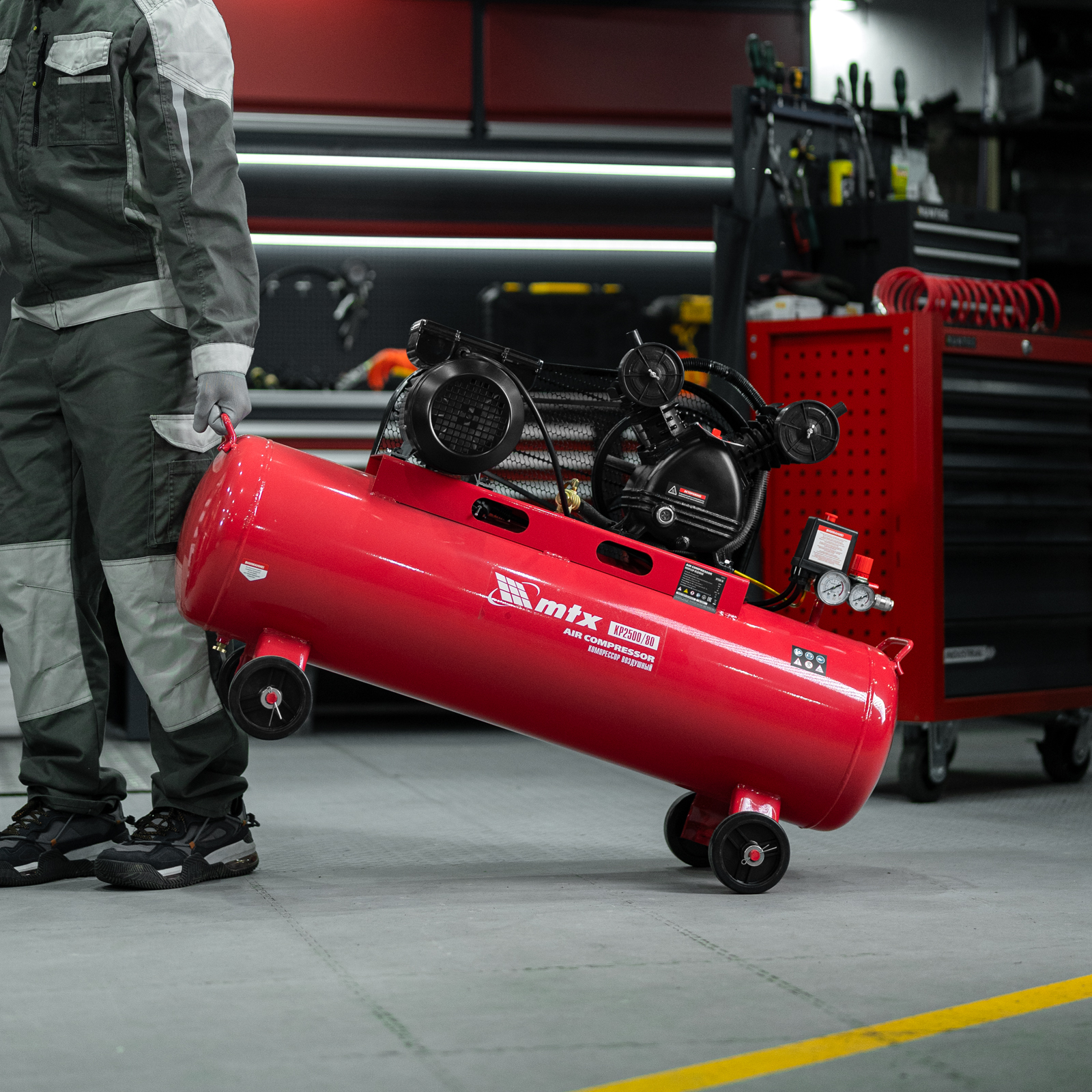 Компрессор воздушный МТХ КР2500/80 58022 с ременным приводом от электродвигателя, мощностью 2,5 кВт и производительностью 420 л/мин, с ресивером объемом 80 литров, применяется для подачи сжатого атмосферного воздуха к пневматическому инструменту. К нему можно подключить гайковерт, дрель, углошлифовальную машину, степлер, краскопульт, продувочный пистолет или другой пневмоинструмент. Для подключения предусмотрены 2 штуцера: быстросъемный и «елочка». Компрессор подходит для профессионального использования на предприятии автосервиса, строительной площадке, в мастерской.