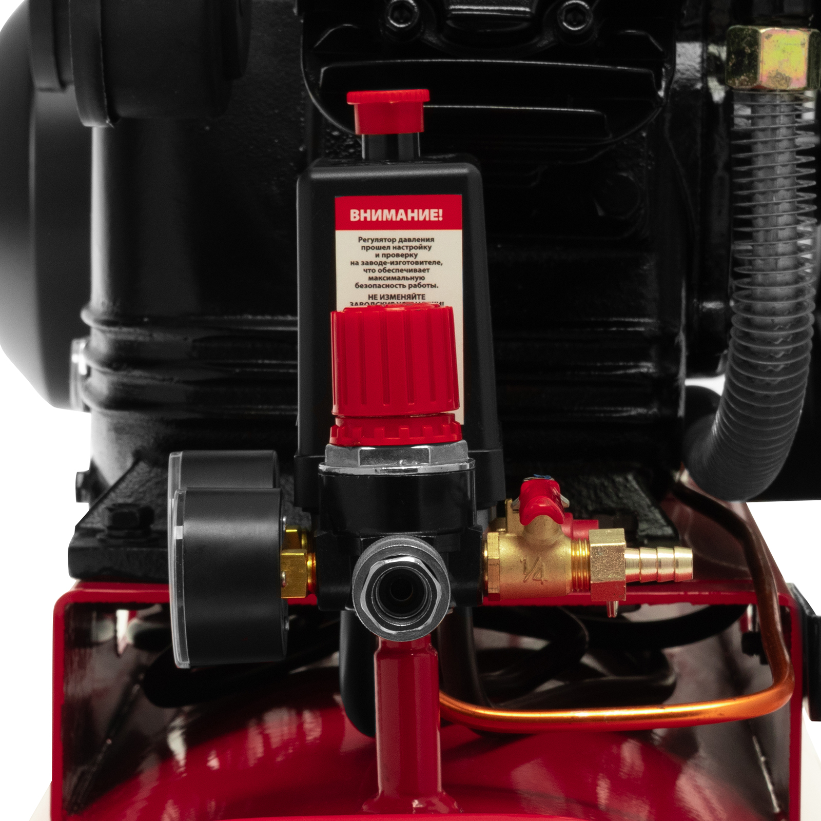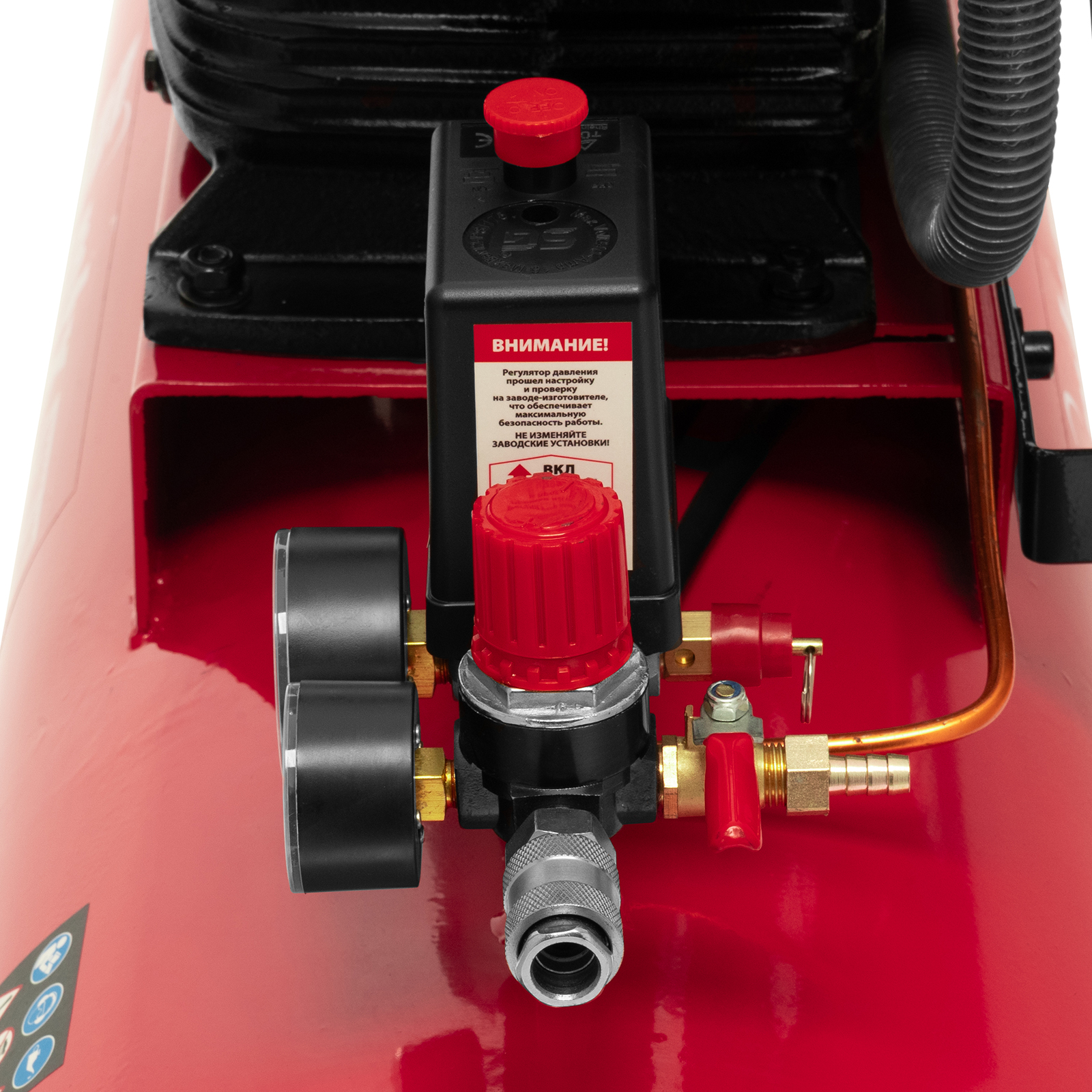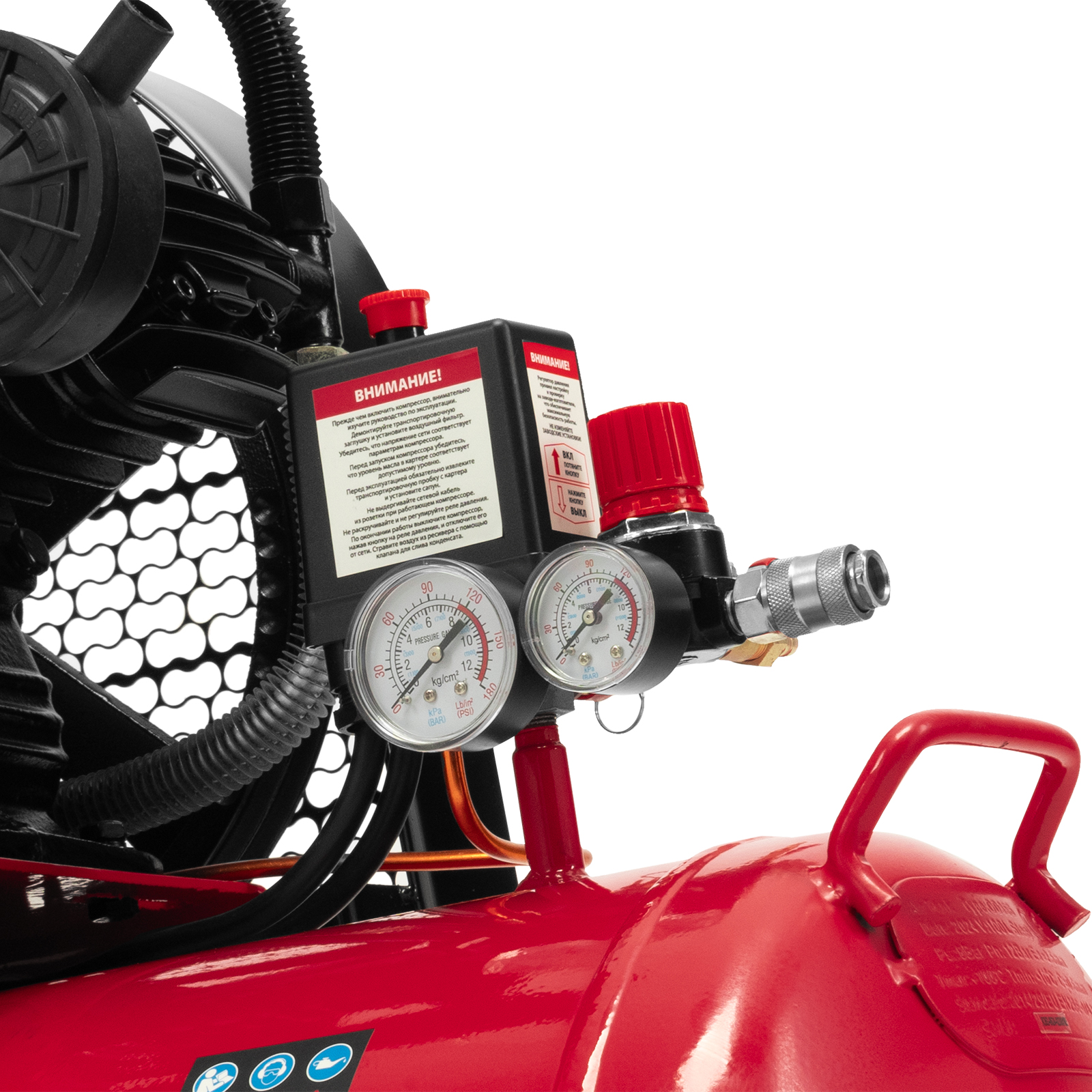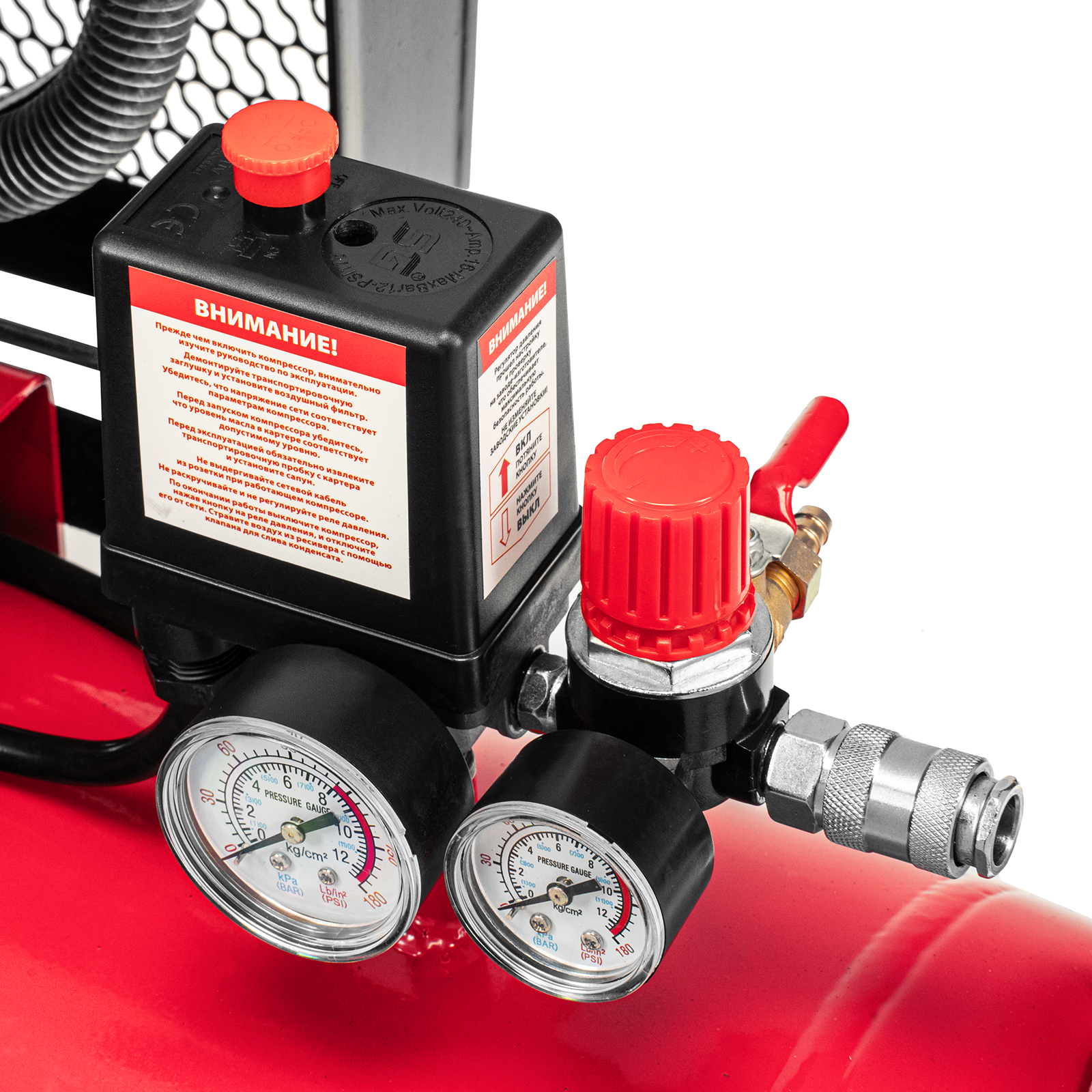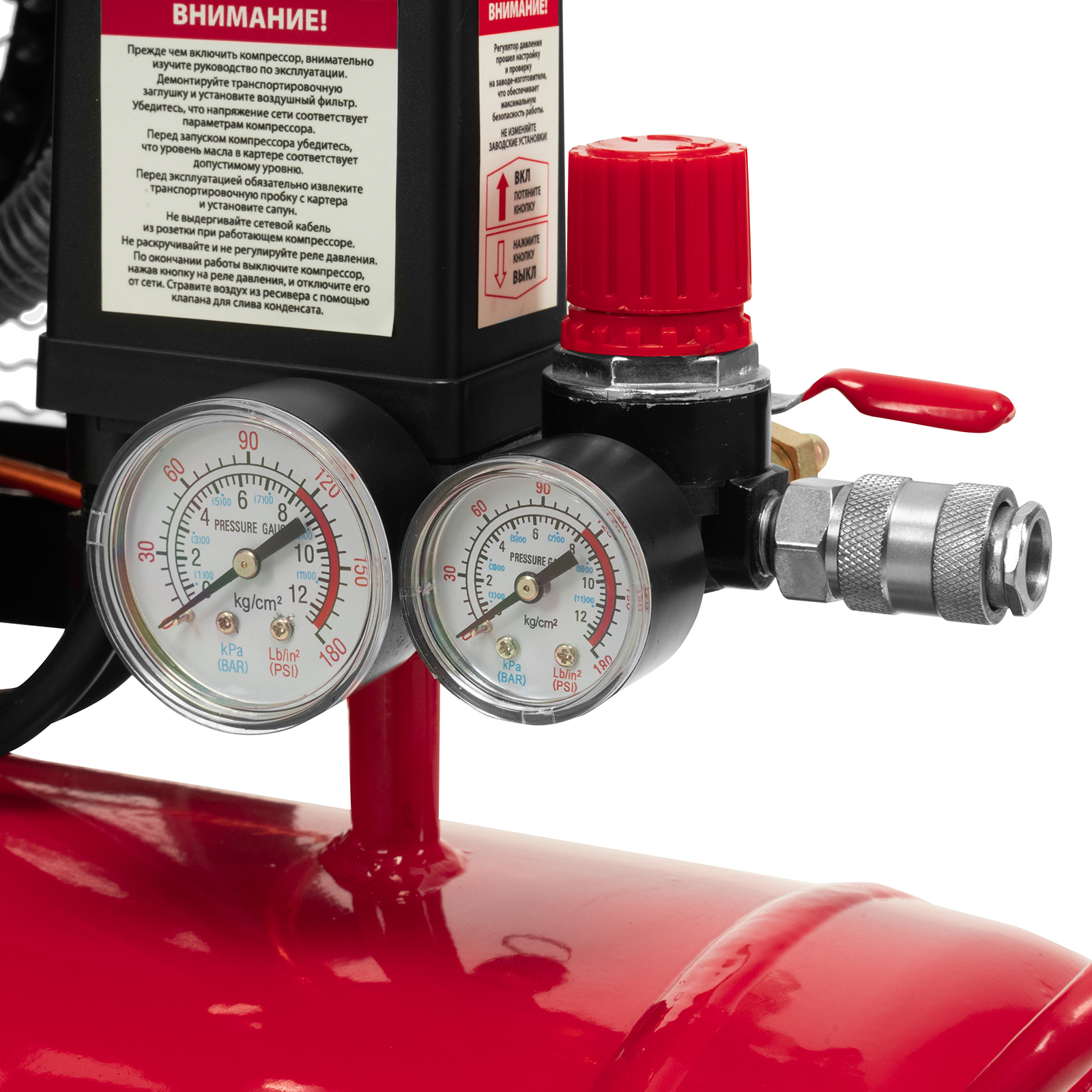 - Удобный контроль давления в ресивере и пневмомагистрали — компрессор оснащен двумя механическими манометрами.