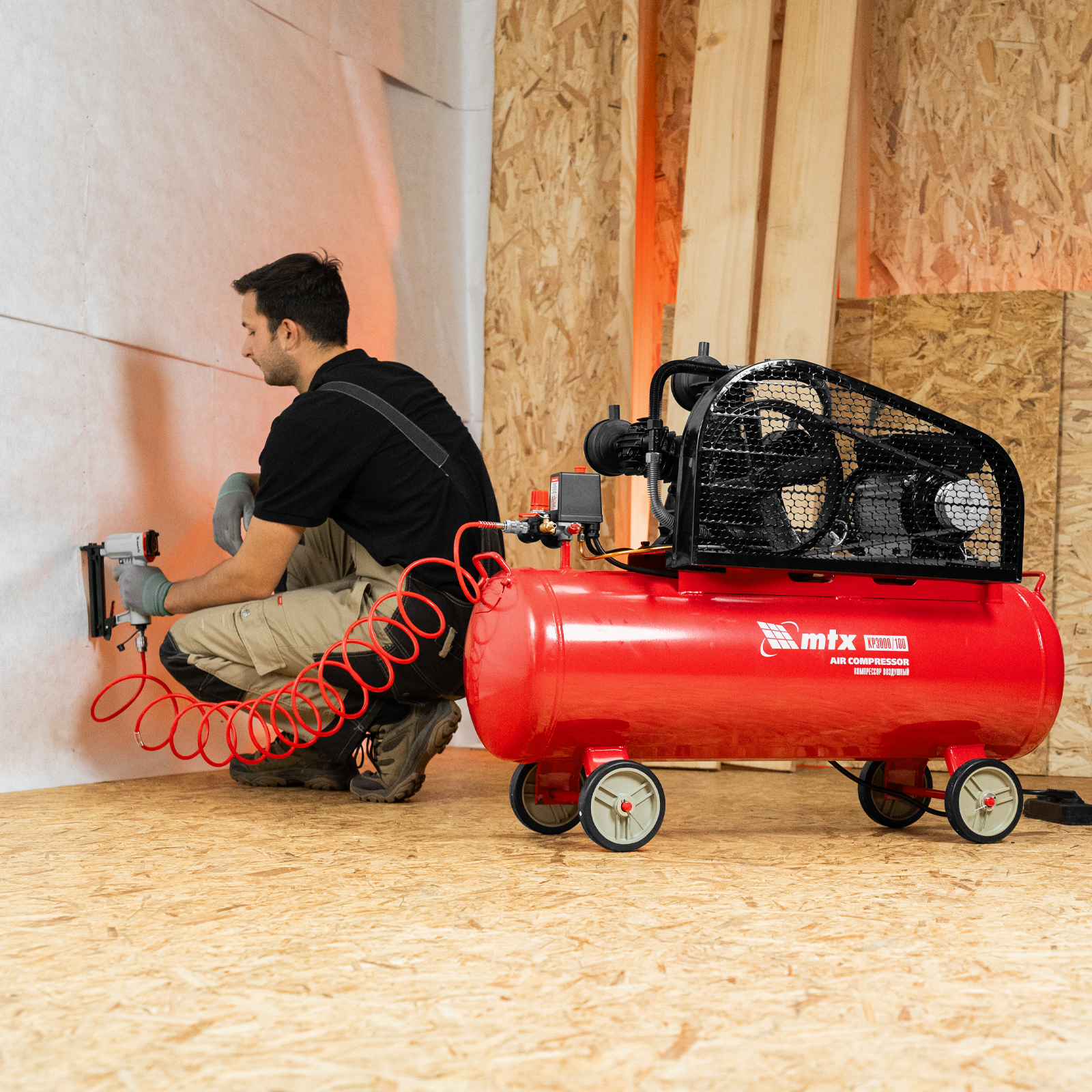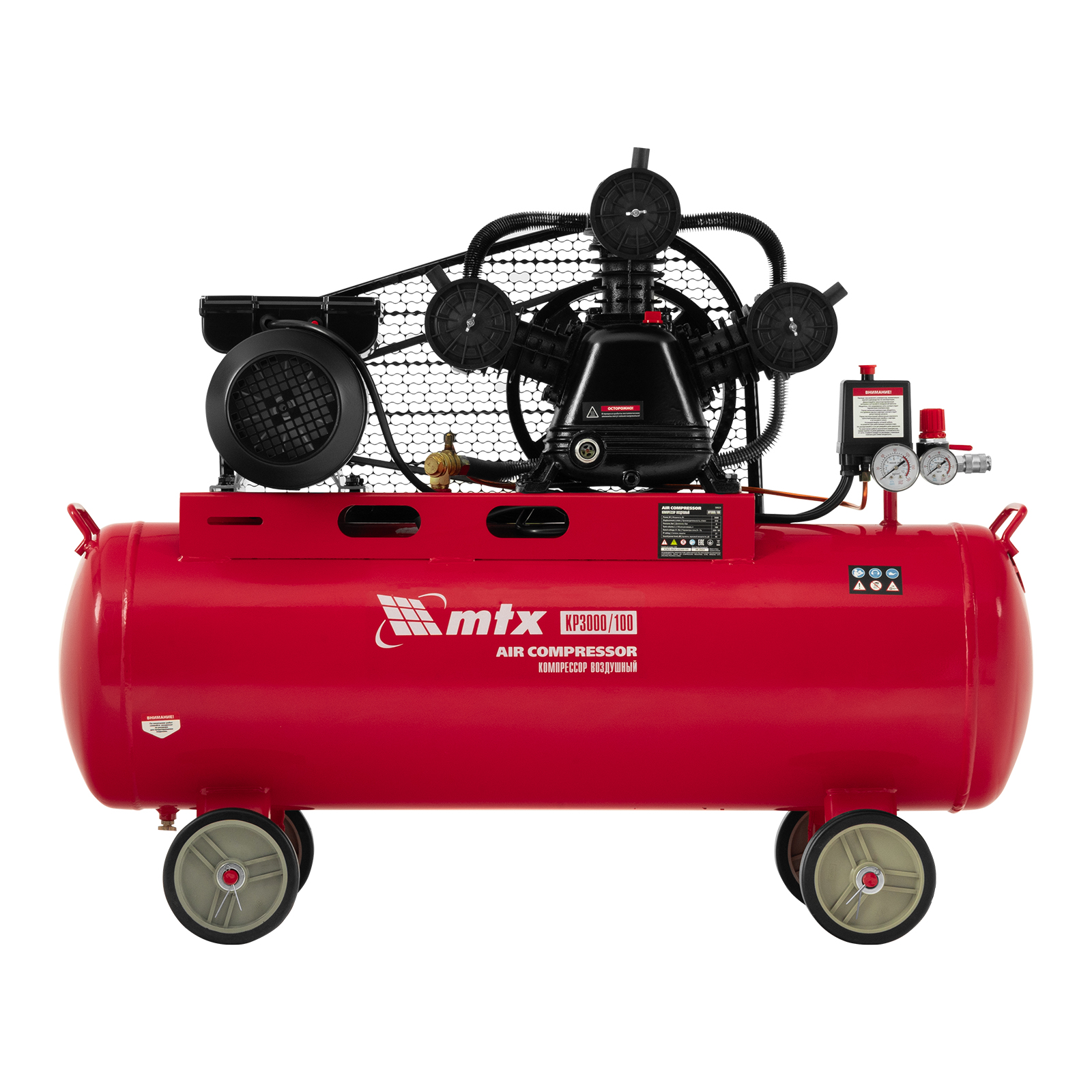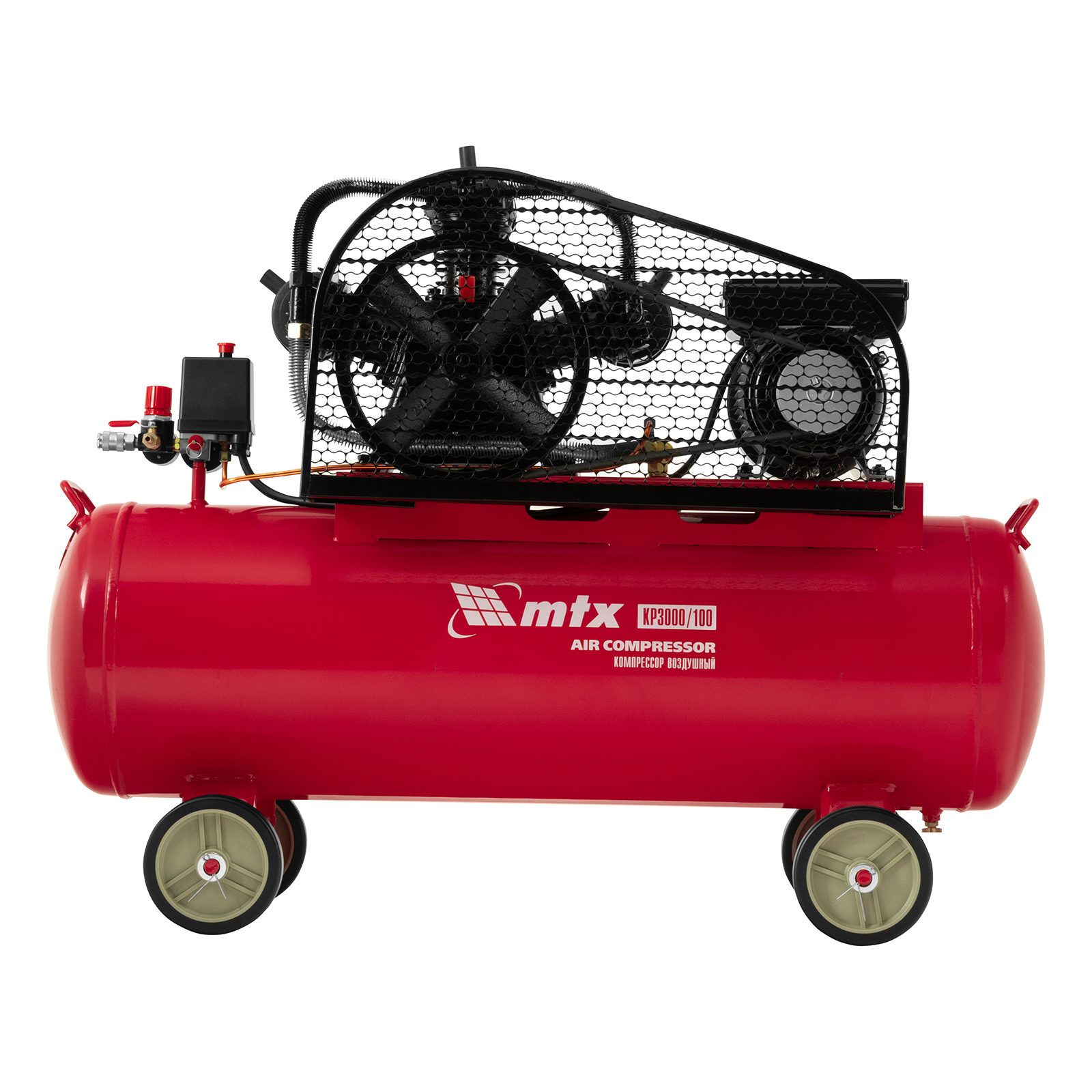 Компрессор воздушный МТХ КР3000/100 58023 с ременным приводом от электродвигателя, мощностью 3,0 кВт и производительностью 510 л/мин, с ресивером объемом 100 литров, применяется для подачи сжатого атмосферного воздуха к пневматическому инструменту. К нему можно подключить гайковерт, дрель, углошлифовальную машину, степлер, краскопульт, продувочный пистолет или другой пневмоинструмент. Для подключения предусмотрены 2 штуцера: быстросъемный и «елочка». Компрессор подходит для профессионального использования на предприятии автосервиса, строительной площадке, в мастерской.