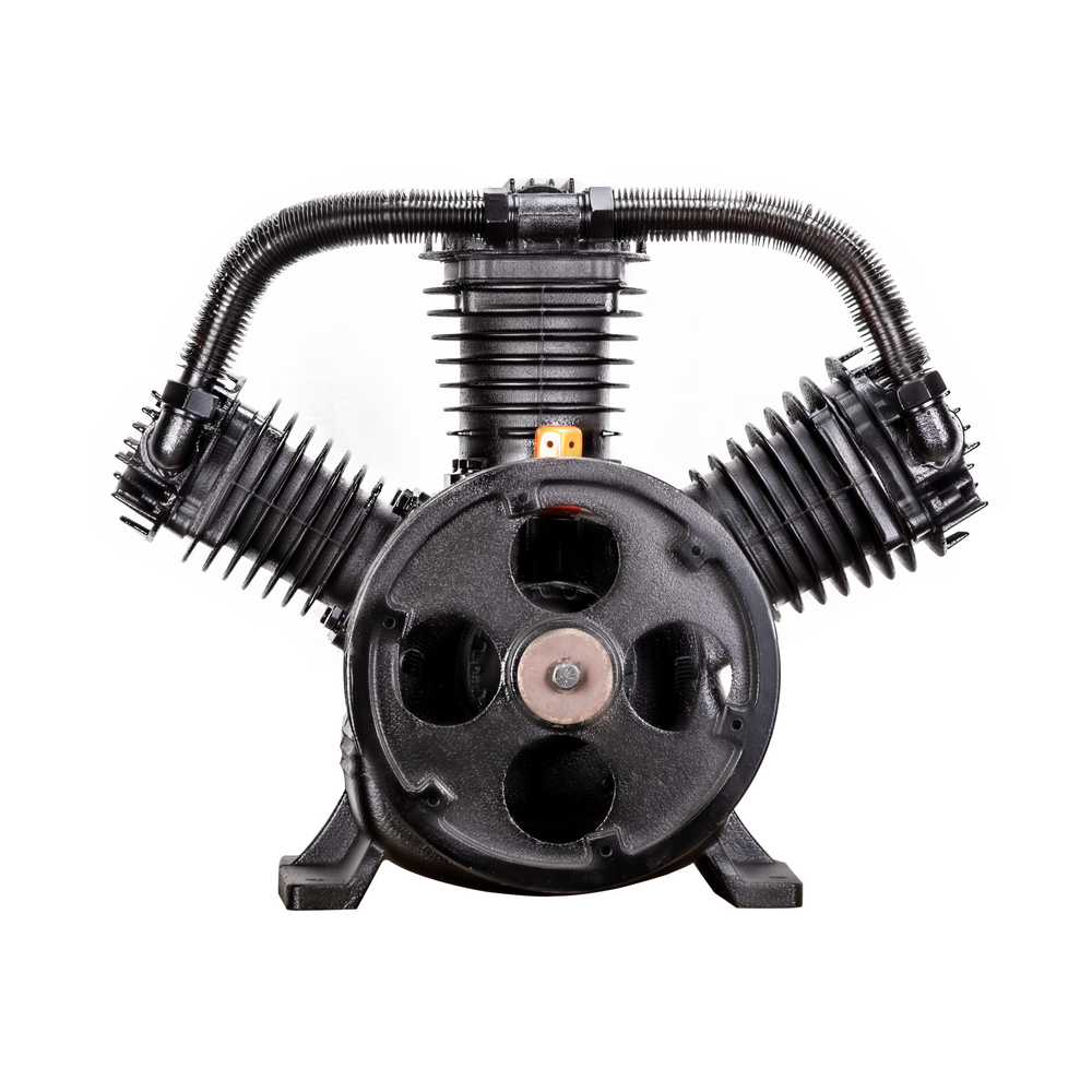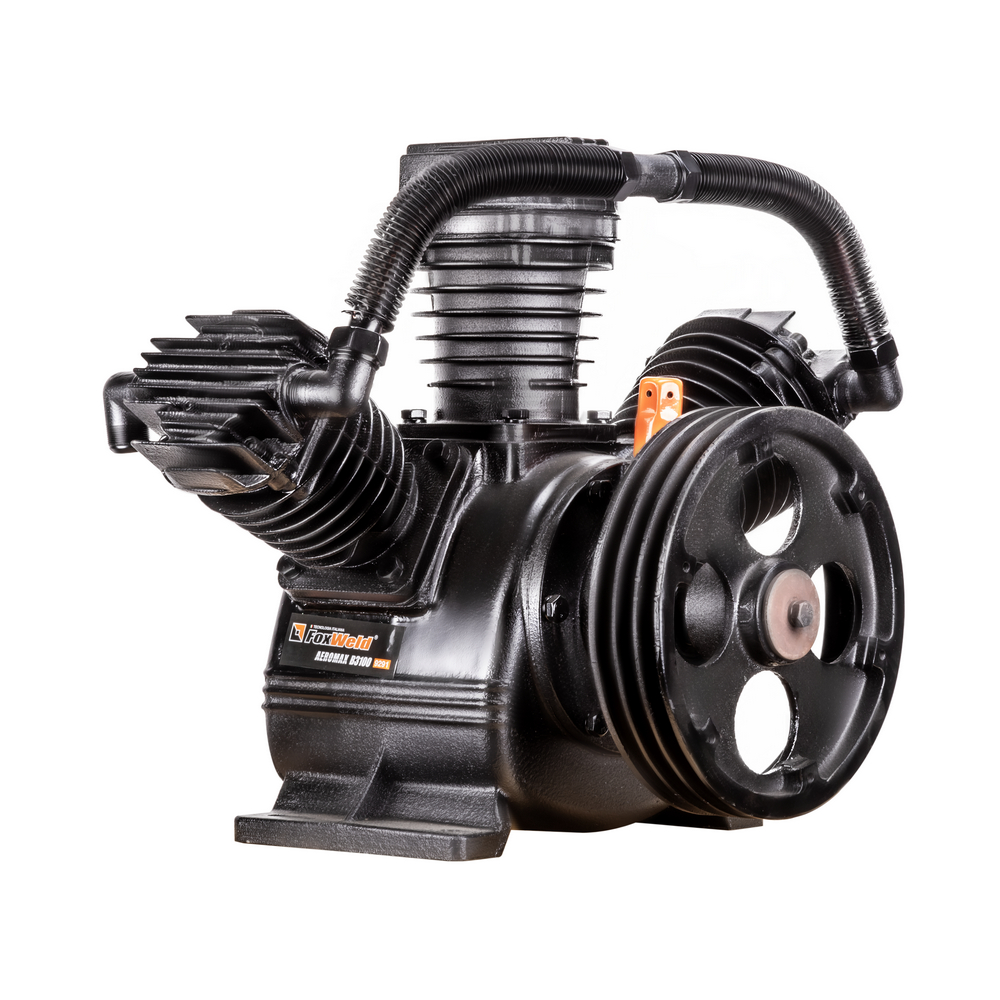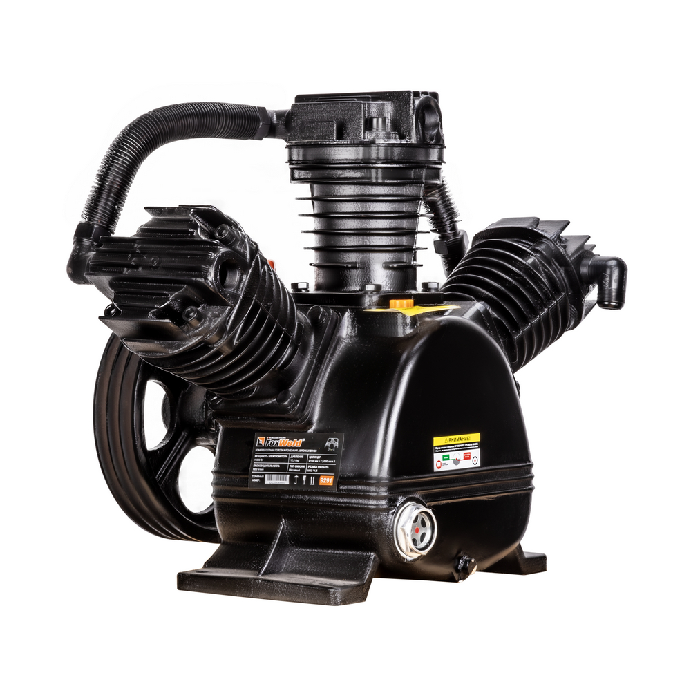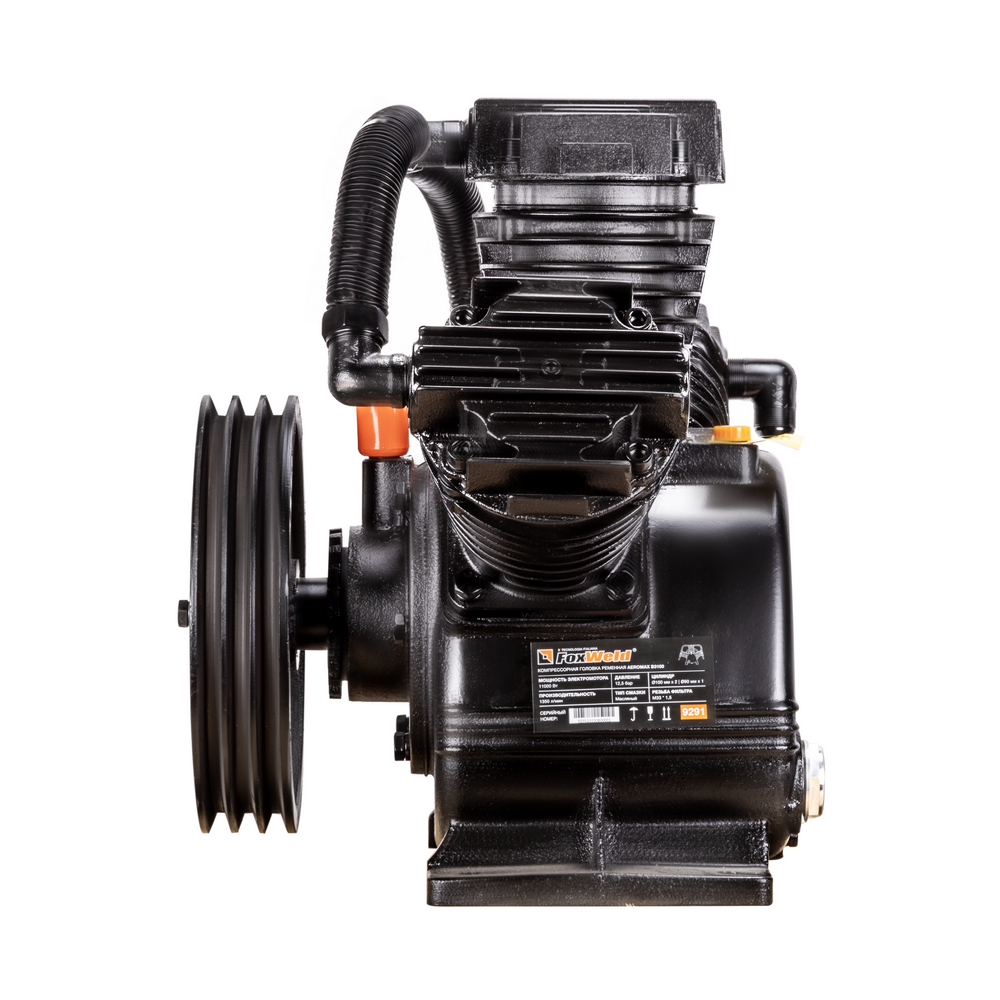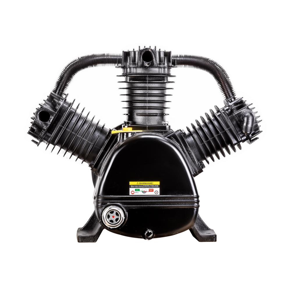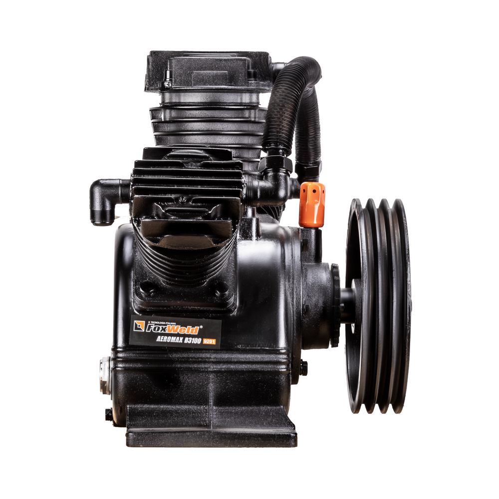 Компрессорная головка ременная AEROMAX B3100 – это сменная помпа (нагнетательная часть) для поршневых ременных масляных воздушных компрессоров. В конструкции головки три поршня диаметром 90 мм. Мощность подключаемого электродвигателя должна быть не менее 11 кВт. При данной мощности производительность на входе может достигать 1350 л/мин при рабочем давлении до 12,5 бар. Рёбра охлаждения (рубашки) на цилиндрах и лопасти на ведомом шкиве обеспечивают эффективное охлаждение. Ведомый двухручейковый предустановлен и идёт в комплекте. Для смазки цилиндропоршневой группы предусмотрен встроенный масляный картер для компрессорного масла VDL 100. Подключение к компрессору механическое - через ременную передачу. Воздушная магистраль от ресивера компрессора подключается к выпуску компрессорной головки. Электромотор компрессора через ременную передачу вращает шкив компрессорной головки, приводя в движение поршни внутри цилиндров, которые соответственно тактам производят забор воздуха из окружающей среды через впускное отверстие и под давлением закачивают его в ресивер компрессора по воздушной магистрали. На впуск необходимо установить воздушные фильтры с посадочной резьбой M33 х 1,5 (приобретаются отдельно).ПРЕИМУЩЕСТВА:Универсальная компрессорная головка для двигателя 11 кВтШкив в комплектеСверхпроизводительный трёхцилиндровый одноступенчатый нагнетательКОМПЛЕКТАЦИЯ: Компрессорная головка в сборе со шкивом – 1 шт.; Охлаждающий вентилятор – 1 шт.; Руководство по эксплуатации – 1 шт.