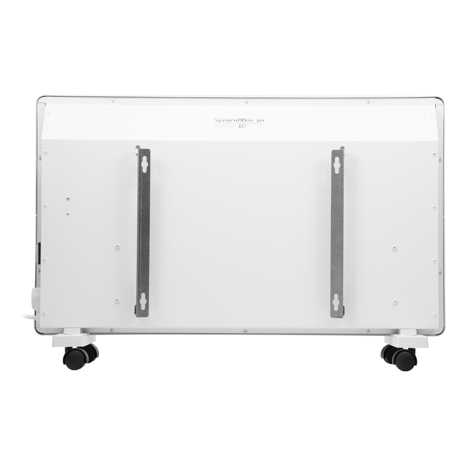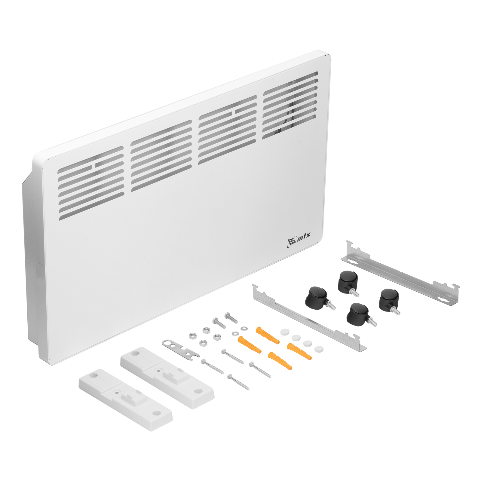 - Два варианта монтажа — конвектор можно расположить на полу или повесить на стену (колесные пары и кронштейн входят в комплект поставки).