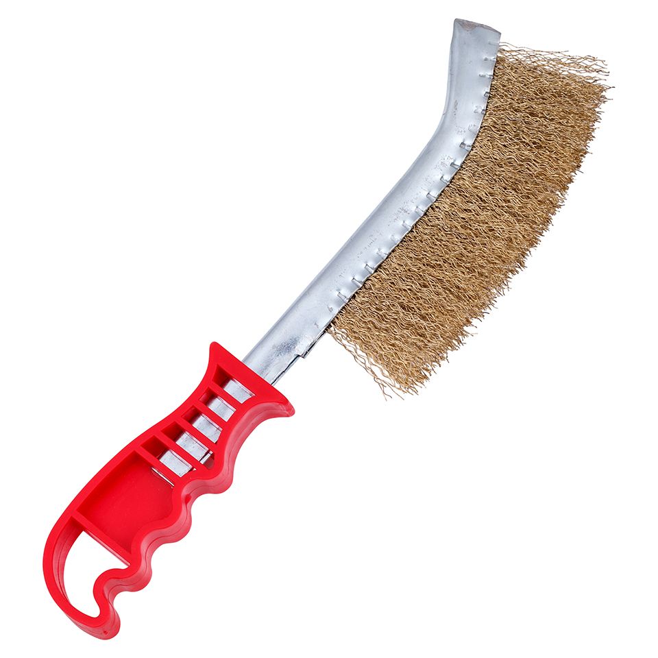 Корщетка с латунированным проволочным ворсом применяется для зачистки швов, удалению металлических заусенцев и сварной окалины, стачиванию острых краев поверхности до сварочных работ. Ручка корщетки для зачистки швов изготовлена из пластика, имеет изогнутую форму и оснащена специальной выемкой для комфортной длительной работы.