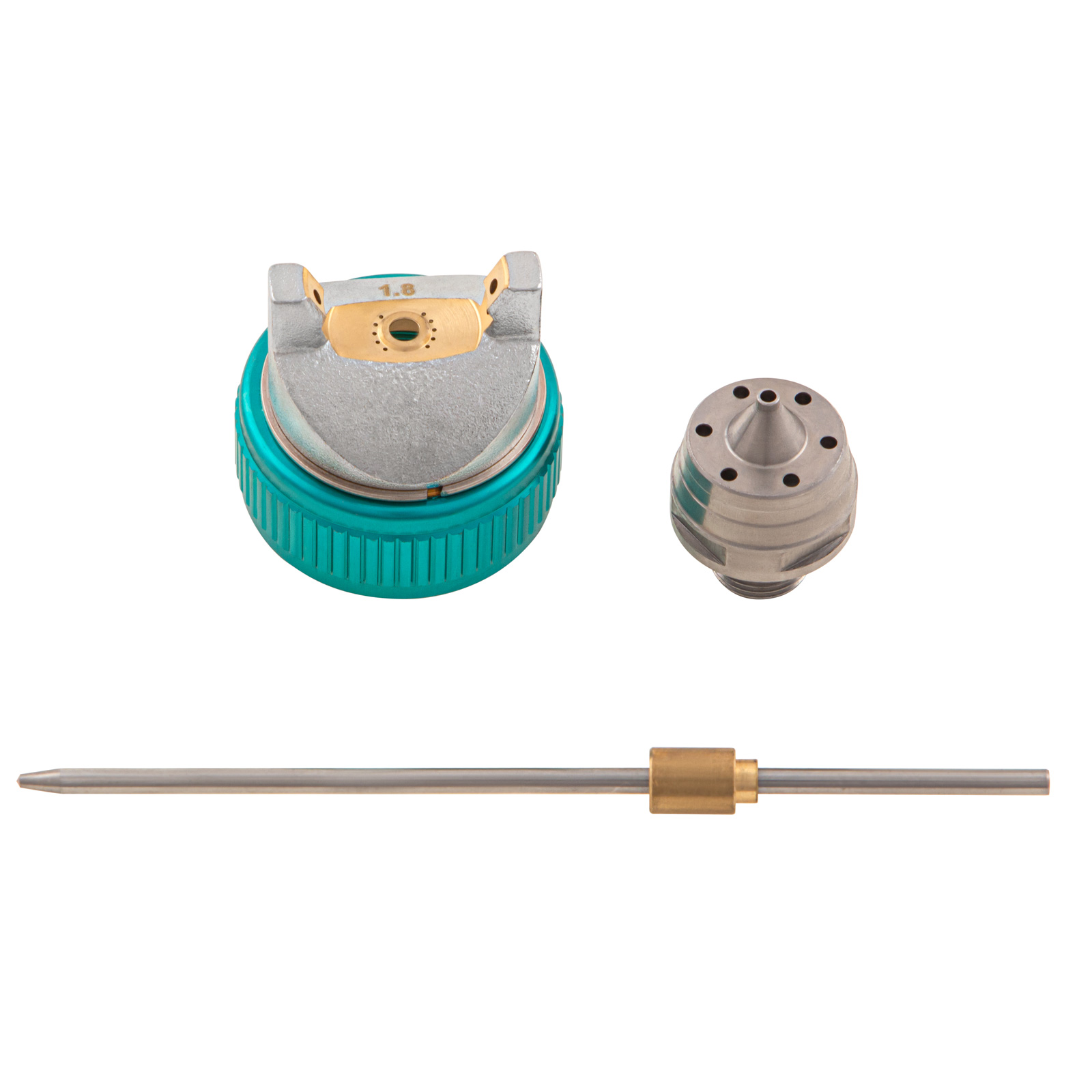 - Необходимые аксессуары в комплекте — краскопульт поставляется с дополнительным дюзовым набором (сопла 1,5 и 1,8 мм, распыляющая головка и игла) и универсальным ключом.