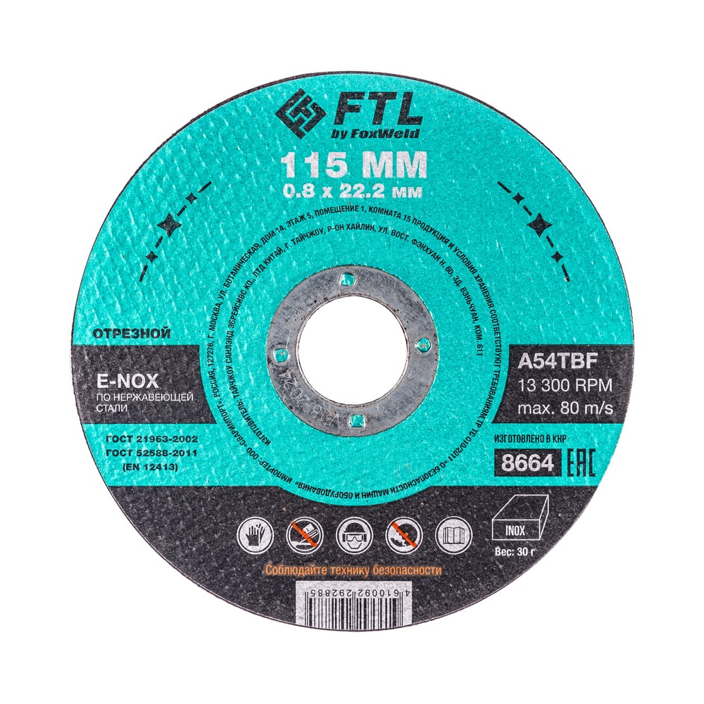 Круг отрезной по нержавеющей стали FTL E-Nox 115 х 0,8 х 22,2 мм A54TBF