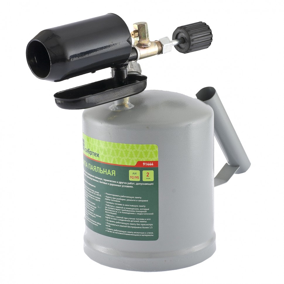 Паяльная лампа Сибртех 91444 с баком объемом 2 л используется для нагрева поверхностей. Она применяется для выполнения монтажных и демонтажных работ, полезна также и для решения бытовых задач. Паяльной лампой можно разогревать жало паяльника и припой, варить медные трубы, нагревать заржавевшие или замерзшие соединения, снимать лакокрасочные покрытия, устанавливать термоусадочные трубки, а при наличии специальной подставки лампа поможет даже приготовить пищу. Она работает на любом бензине, кроме этилированного, а значит, проблем с заправкой не будет — достаточно заехать на АЗС.