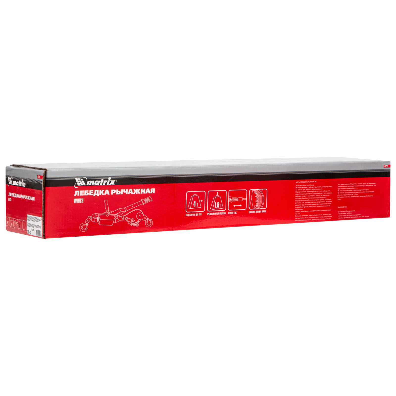 Рычажная лебедка Matrix 52225, тяга - 4 т, подъем - 1,6 т, с двойным храповым колесом, — это незаменимое устройство для автомобилистов. С его помощью можно эвакуировать автомобиль в условиях бездорожья и поднимать грузы в горизонтальном и вертикальном направлении при проведении строительных, монтажных и погрузочно-разгрузочных работ. Благодаря рычажному механизму лебедка проста в использовании и не требует больших усилий от оператора.