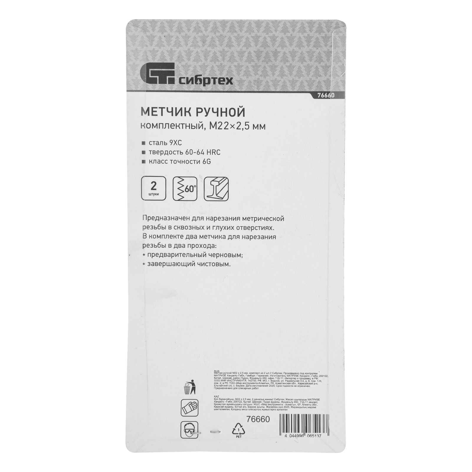 Метчик ручной М22 х 2.5 мм, комплект из 2 шт Сибртех