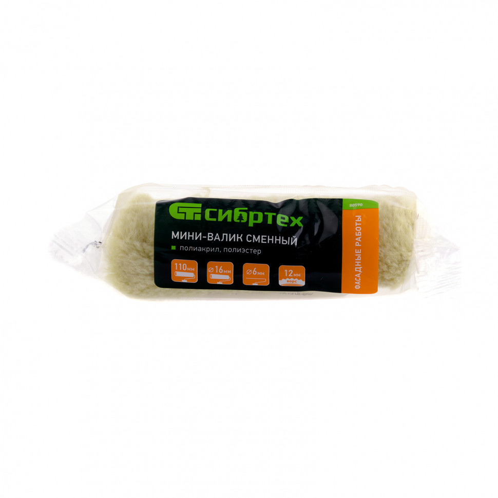Сменный мини-валик Сибртех «Фасадные работы» 80590 с ворсом 12 мм из полиакрила и полиэстера, роликом 110 х 16 мм, предназначен для установки на ручку диаметром 6 мм. Его используют при проведении фасадных работ для нанесения ЛКМ на грубые участки с неровностями.