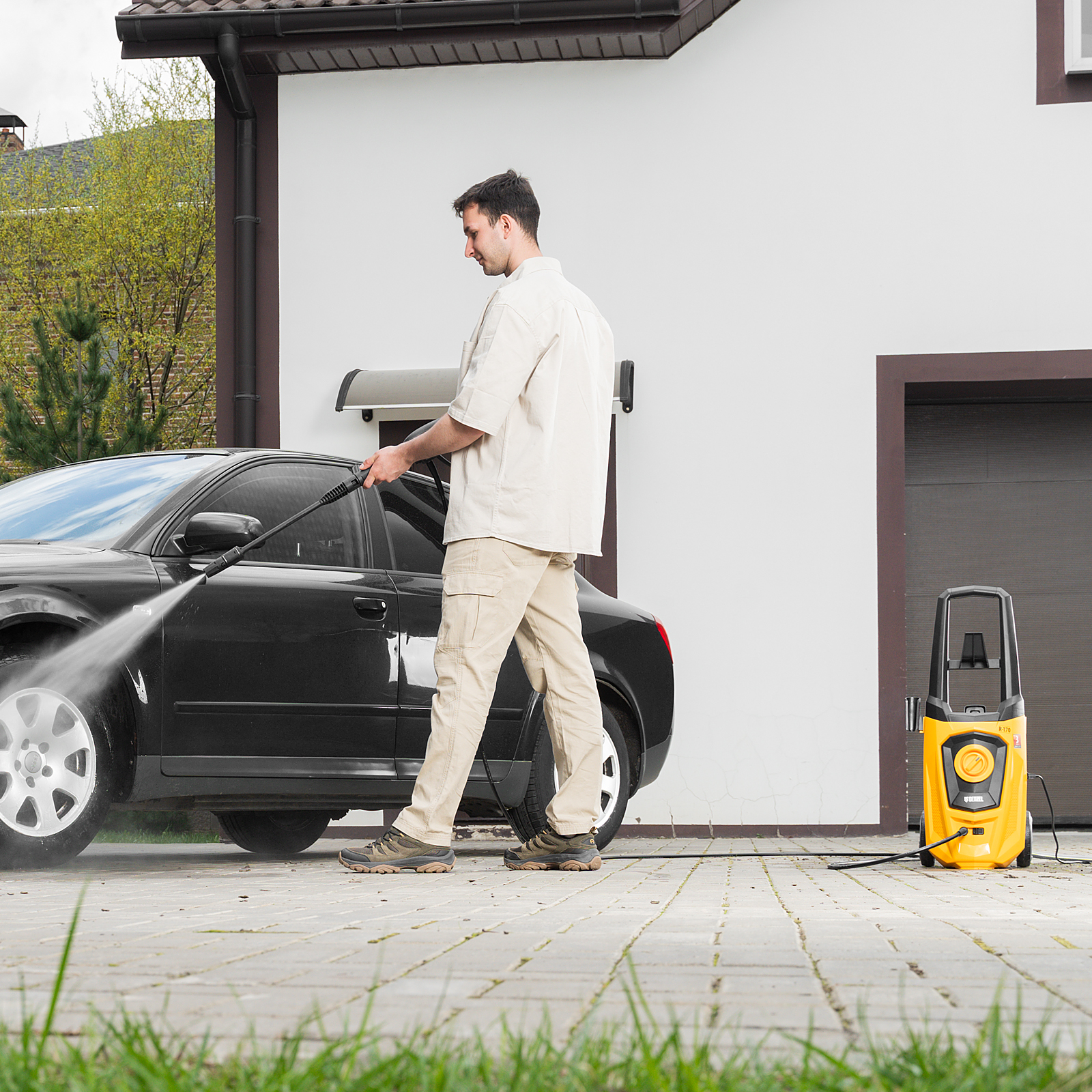 - Длина шланга и кабеля 5 м — не нужно часто перемещать машину, можно работать на удалении от розетки.