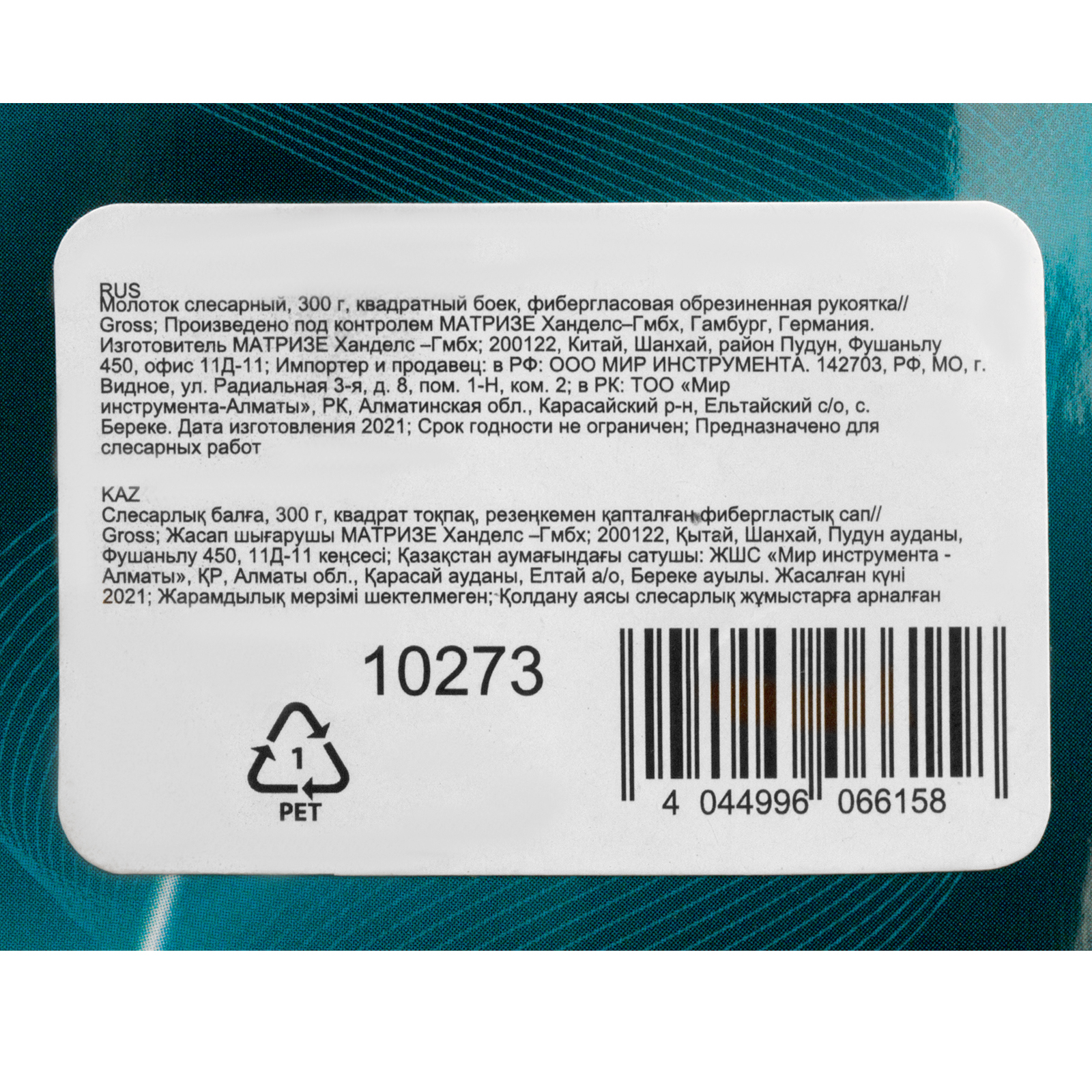 Молоток слесарный, 300 г, квадратный боек, фибергласовая обрезиненная рукоятка Gross в Казани