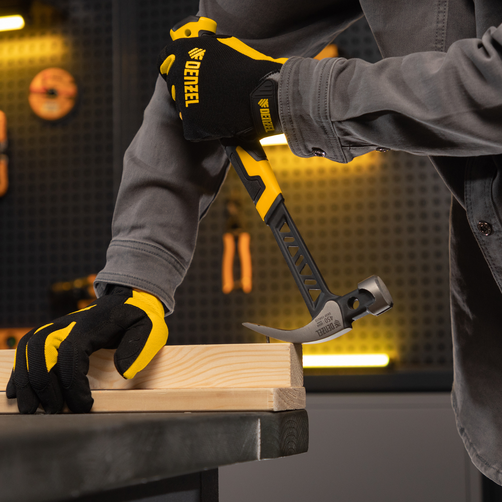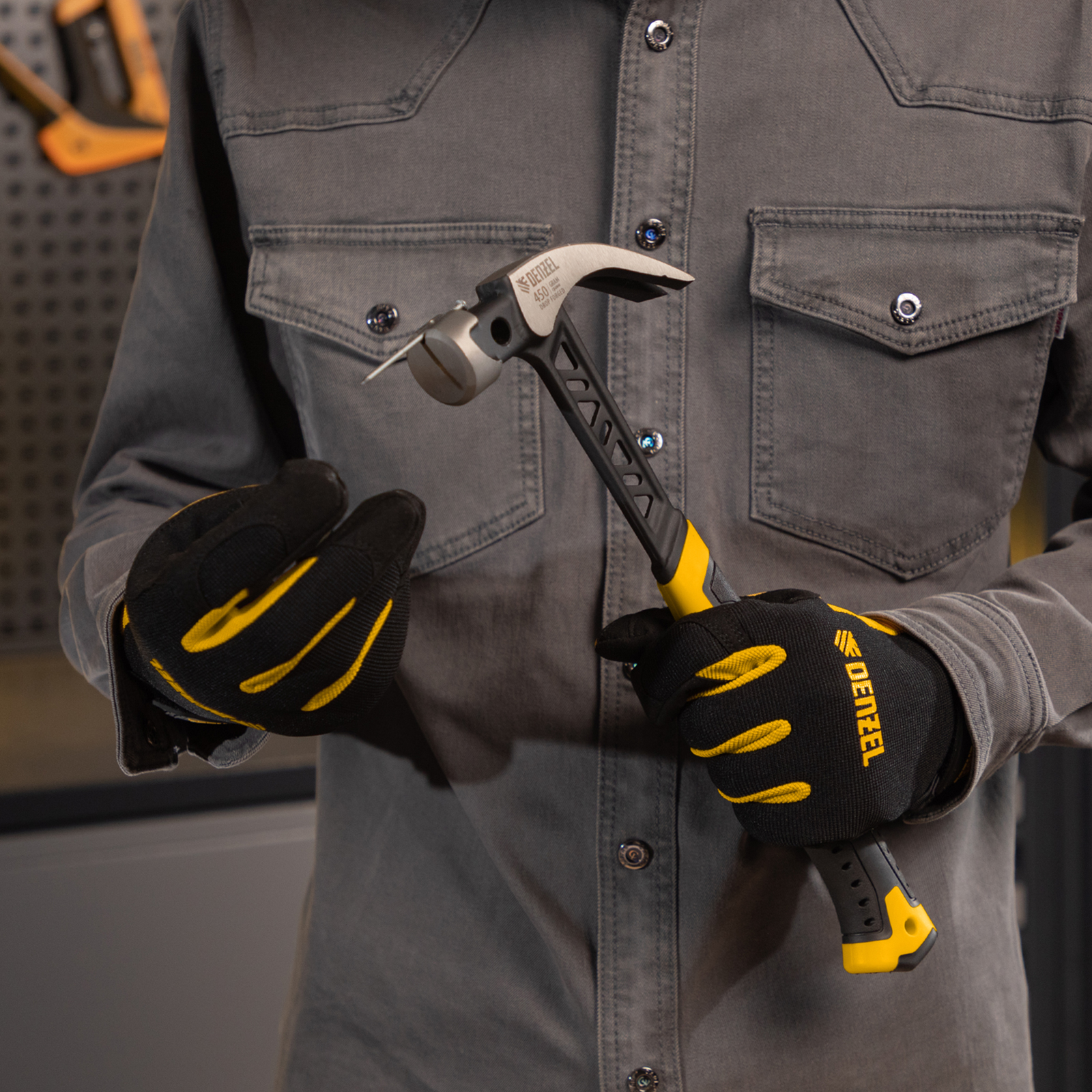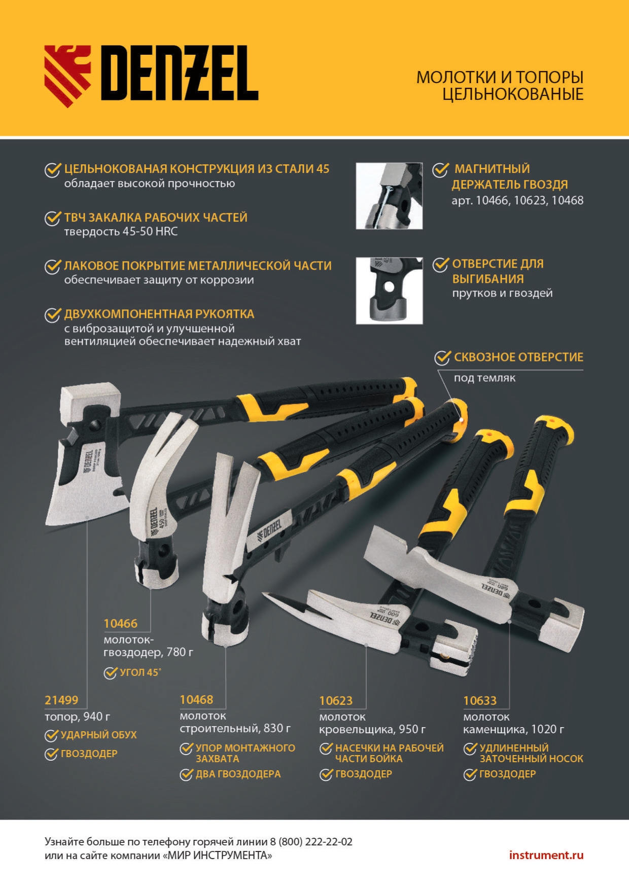Цельнокованый молоток-гвоздодер Denzel 10466 с бойком весом 450 г, с магнитом и двухкомпонентной обрезиненной рукояткой, предназначен для забивания и извлечения гвоздей. Имеет рабочую часть специальной формы — с круглым бойком и плоским носком с клиновидной прорезью. Магнитный держатель в верхней части бойка позволяет установить гвоздь, не придерживая его рукой, что упрощает работу в труднодоступных местах. Молоток используется в профессиональной сфере, пригодится также и в быту.