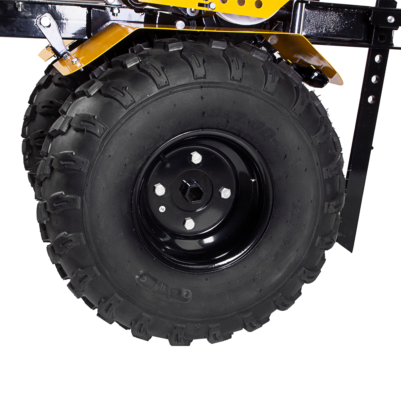 - Уверенное сцепление с любой поверхностью — пневматические колеса диаметром 49 см защищены от проколов протекторами и обеспечивают хорошую амортизацию, поэтому пройти получится даже по неровному участку, не боясь за оборудование.