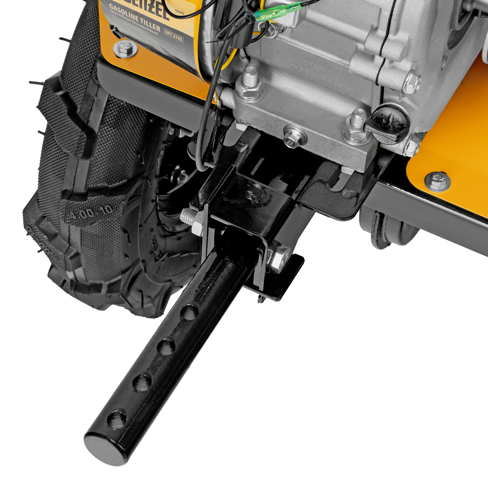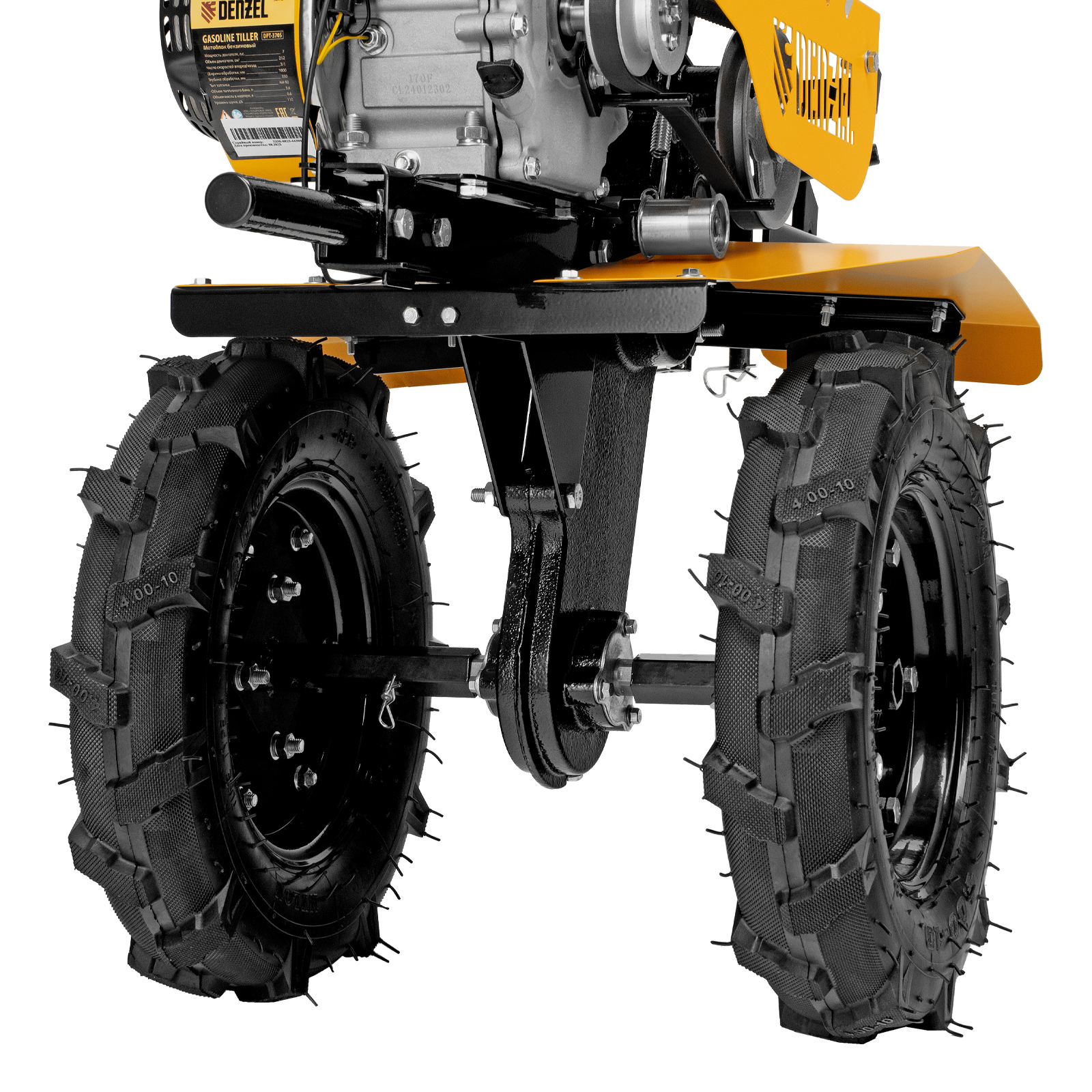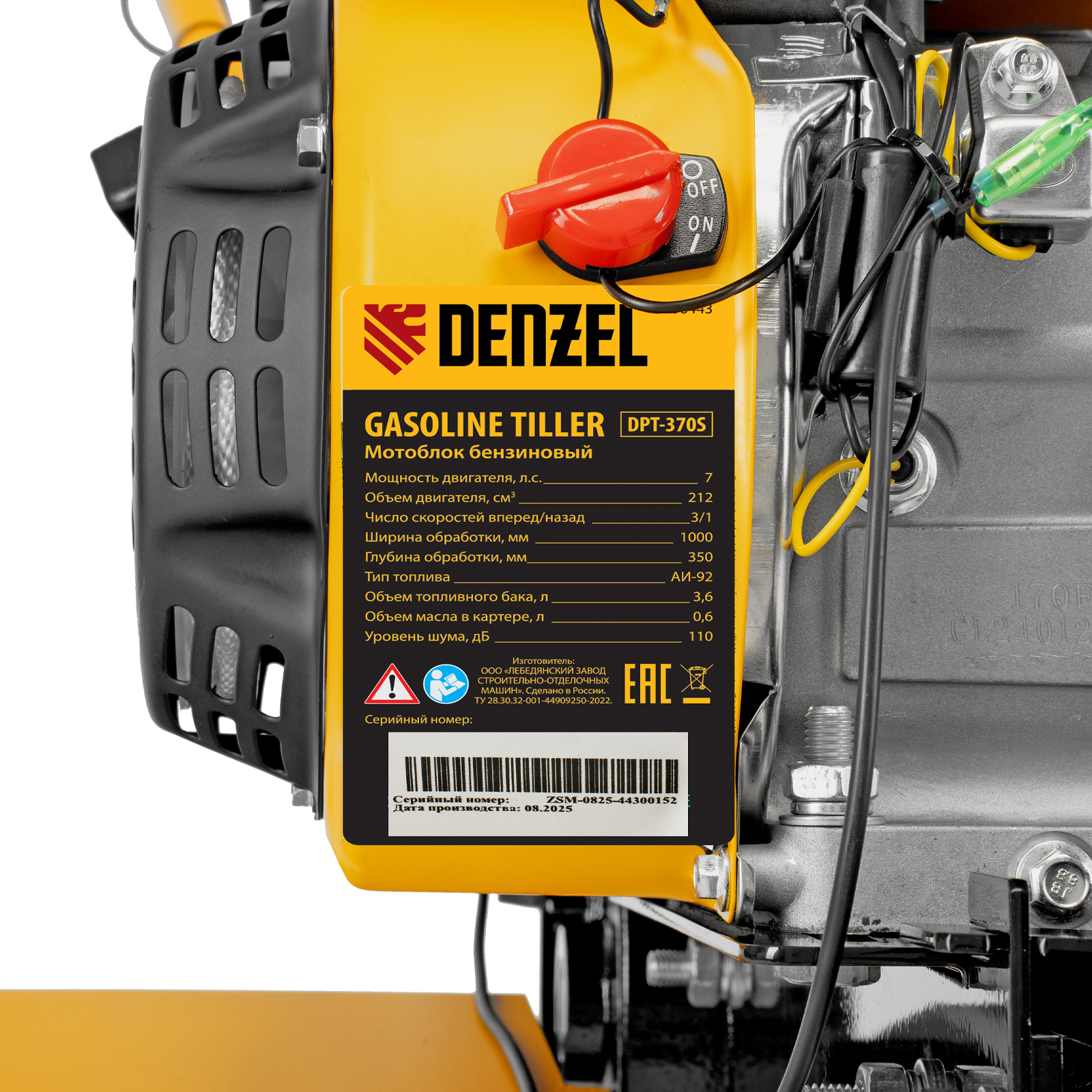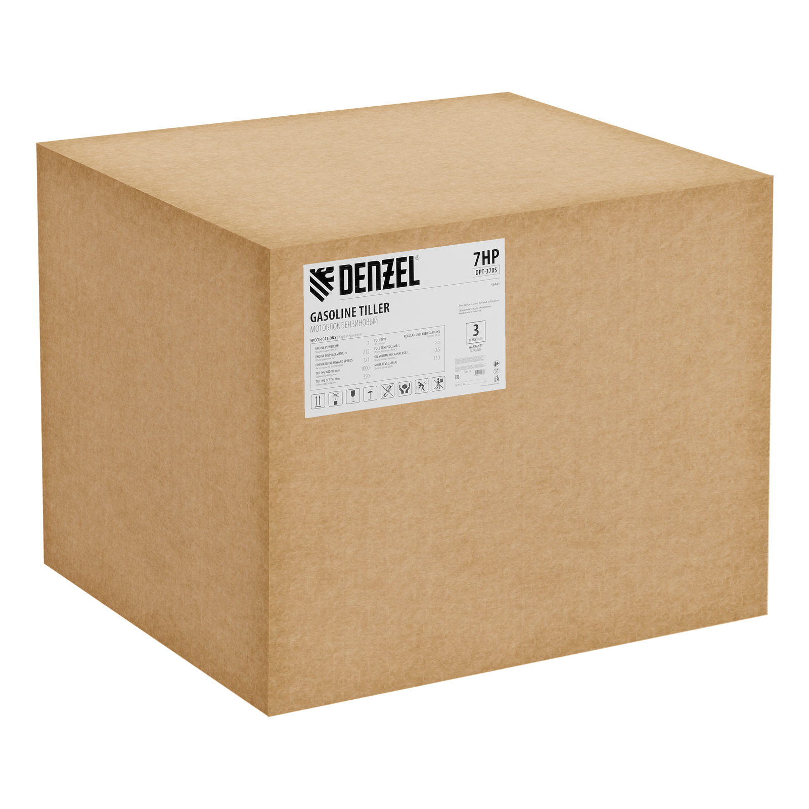 Мотоблок Denzel DPT-370S 56443 мощностью 7 л. с., с 24 фрезами (3 х 4 с каждой стороны), шкивом отбора мощности (ШОМ), количеством передач 3 вперед/1 назад, предназначен для рыхления, боронования, выравнивания почвы, прополки и выполнения других сельскохозяйственных работ на огородных и садовых участках при температуре от -15 до +40 ℃. Максимальная ширина обработки достигает 1000 мм, максимальная глубина — 350 мм.