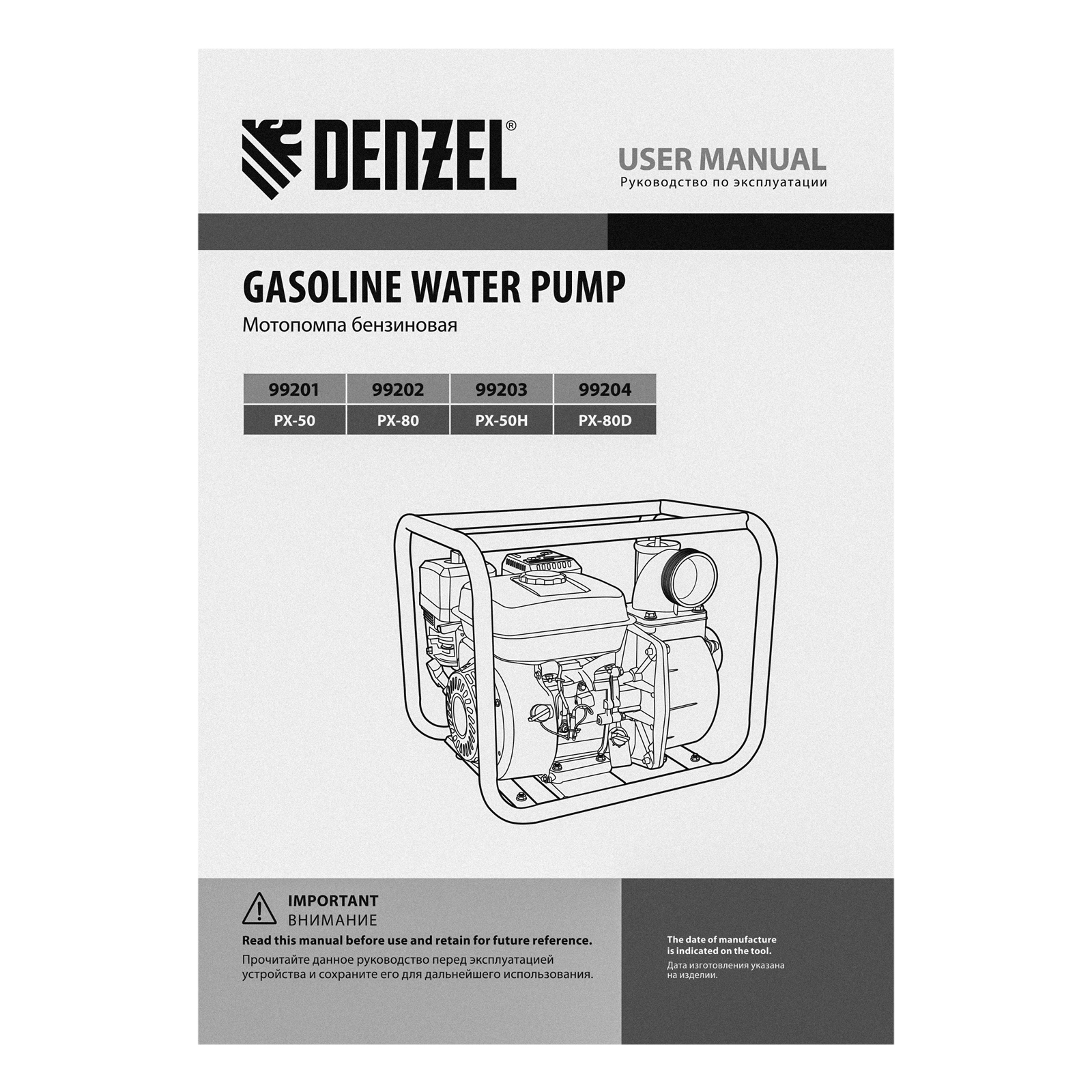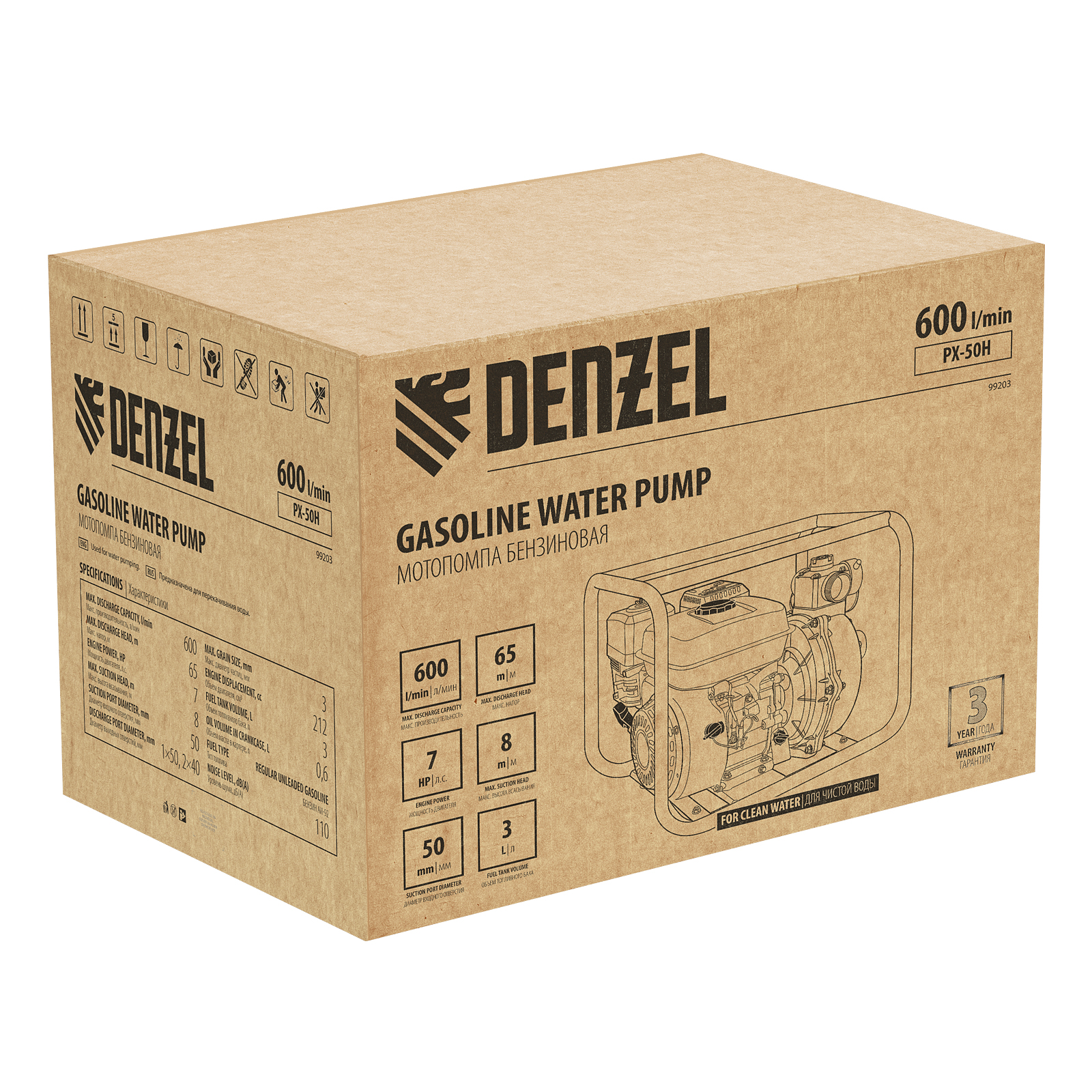 Мотопомпа бензиновая высоконапорная PX-50H, 7 л.с, 2", 600 л/мин, глубина 8 м, напор 65 м Denzel
