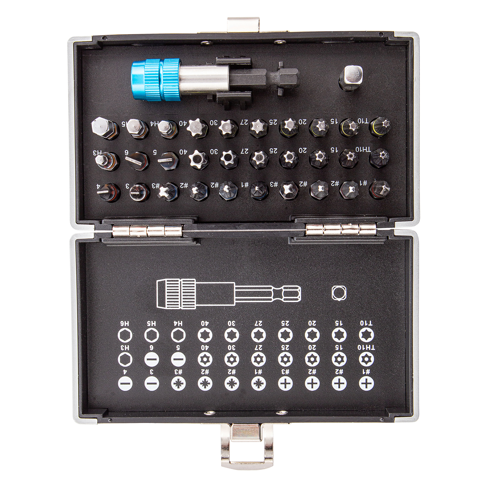 Пластиковый кейс - 1 штБиты 25 мм: РН1, РН2 (2 шт), РН3, PZ1, PZ2 (2 шт), PZ3, SL3, SL4, SL5, SL6, H3, H4, H5, H6, T10, T15, T20, T25, Т27, Т30, Т40, TТ10, TТ15, TТ20, ТT25, ТТ27, ТТ30, ТТ40 - 30 штАдаптер для торцевых головок 1/4" - 1 штБитодержатель - 1 штАдаптер - 1 штДержатель бит - 1 шт |