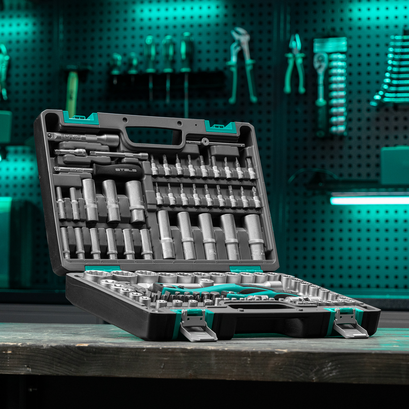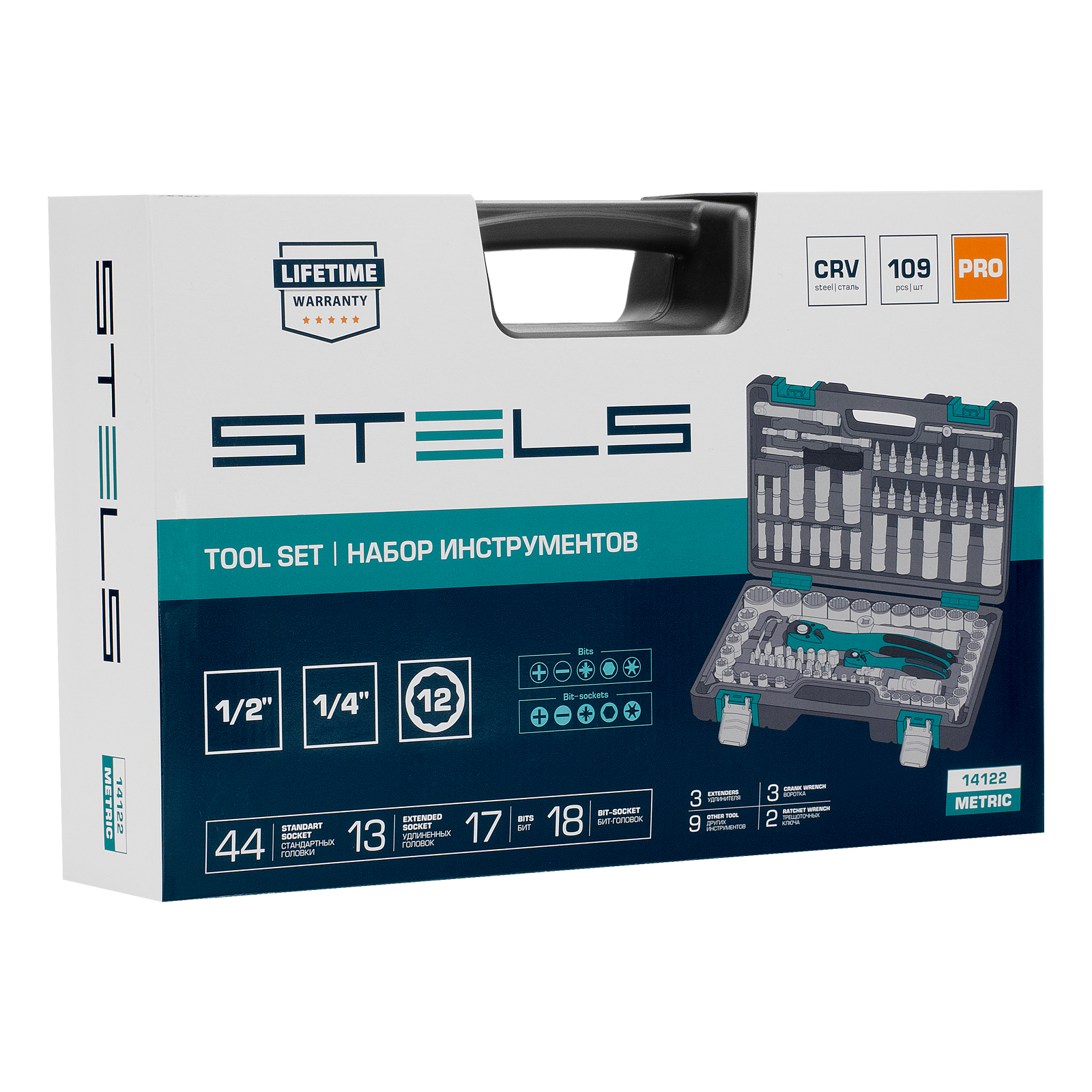 Набор инструментов Stels 14122 в ударопрочным пластиковом кейсе состоит из 109 предметов с присоединительными квадратами 1/2″ и 1/4″, из стали CrV и S2, и предназначен для выполнения слесарно-монтажных работ. Включает инструменты и насадки для работы с резьбовыми крепежами, в том числе 12-гранные торцевые головки, т-образный вороток и удлинители, облегчающие работу в труднодоступных местах. Набор предназначен для профессионального использования в автомастерской, будет полезен и для решения бытовых задач.