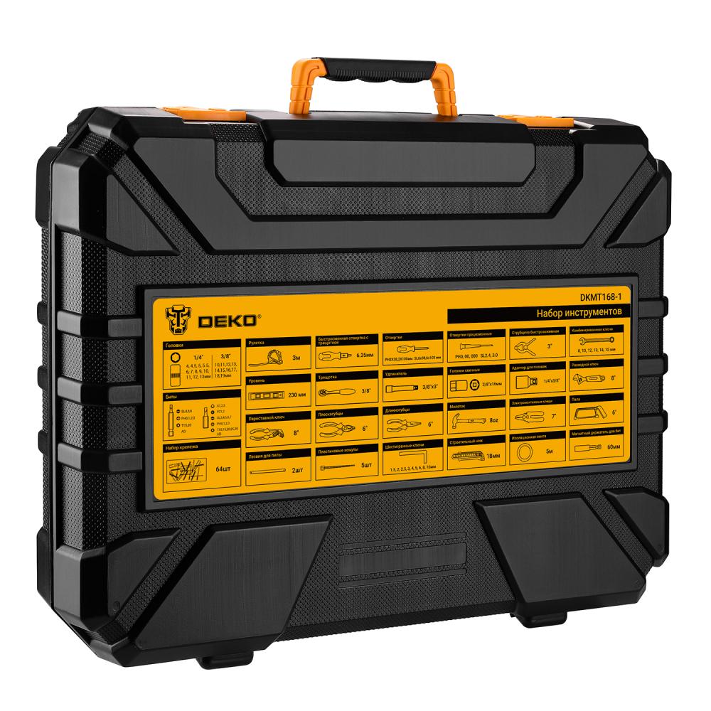 Набор инструментов для дома DEKO DKMT168-1 предназначен для обслуживания автомобилей, а также подойдет для проведения ремонта бытовых конструкций, садовой техники дома и на даче. Все инструменты набора выполнены из стали, что обеспечивает их долгий срок службы.В комплект набора входит:Рулетка 3 м - 1 штОтвертка для бит с трещоткой 6,35 мм - 1 штОтвертки: PH2Х38, 2Х100 мм., SL 6х38, 6х100 мм - 4 штОтвертки точечные: PH0, 00, 000; SL 2.4, 3 мм - 5 штЗажим нейлоновый 3" - 1 штКомбинированные ключи: 8, 10, 12, 13, 14, 15 мм - 6 штУровень 225 мм - 1 штТрещотка 3/8" - 1 штУдлинитель торцевых головок 3/8"х3" - 1 штГоловка свечная 3/8"х16 мм - 1 штГоловки 1/4": 4, 4.5, 5, 5.5, 6, 7, 8, 9, 10, 11, 12, 13 мм - 12 штГоловки 3/8": 10, 11, 12, 13, 14, 15, 16, 17, 18, 19 мм - 10 штАдаптер для головок торцевых: 1/4"х3/8" - 1 штБиты SL3, 4, 5, 6, 7; PH0, 1, 2, 3; PZ1, 2; Т10, 15, 20, 25, 30; S1, 2, 3; AD - 20 штБиты 1/4": SL4, 5, 6; PH0, 1, 2, 3; T15, 20; AD - 10 штРазводной ключ 8" - 1 штРазводной ключ 45 градусов 8" - 1 штПассатижи 6" - 1 штДлинногубцы 6" - 1 штМолоток 0.2 кг - 1 штИнструмент для зачистки проводов 7" - 1 штПила 6" - 1 штСменные полотна для пилы - 2 штХомуты пластиковые - 5 штКлючи шестигранные: 1.5, 2, 2.5, 3, 4, 5, 6, 8, 10 мм - 9 штНож строительный 18 мм - 1 штИзоляционная лента 5 м - 1 штШестигранный адаптер 60 мм - 1 штНабор дюбелей и саморезов (64 шт) - 1 штРуководство по эксплуатации - 1 шт