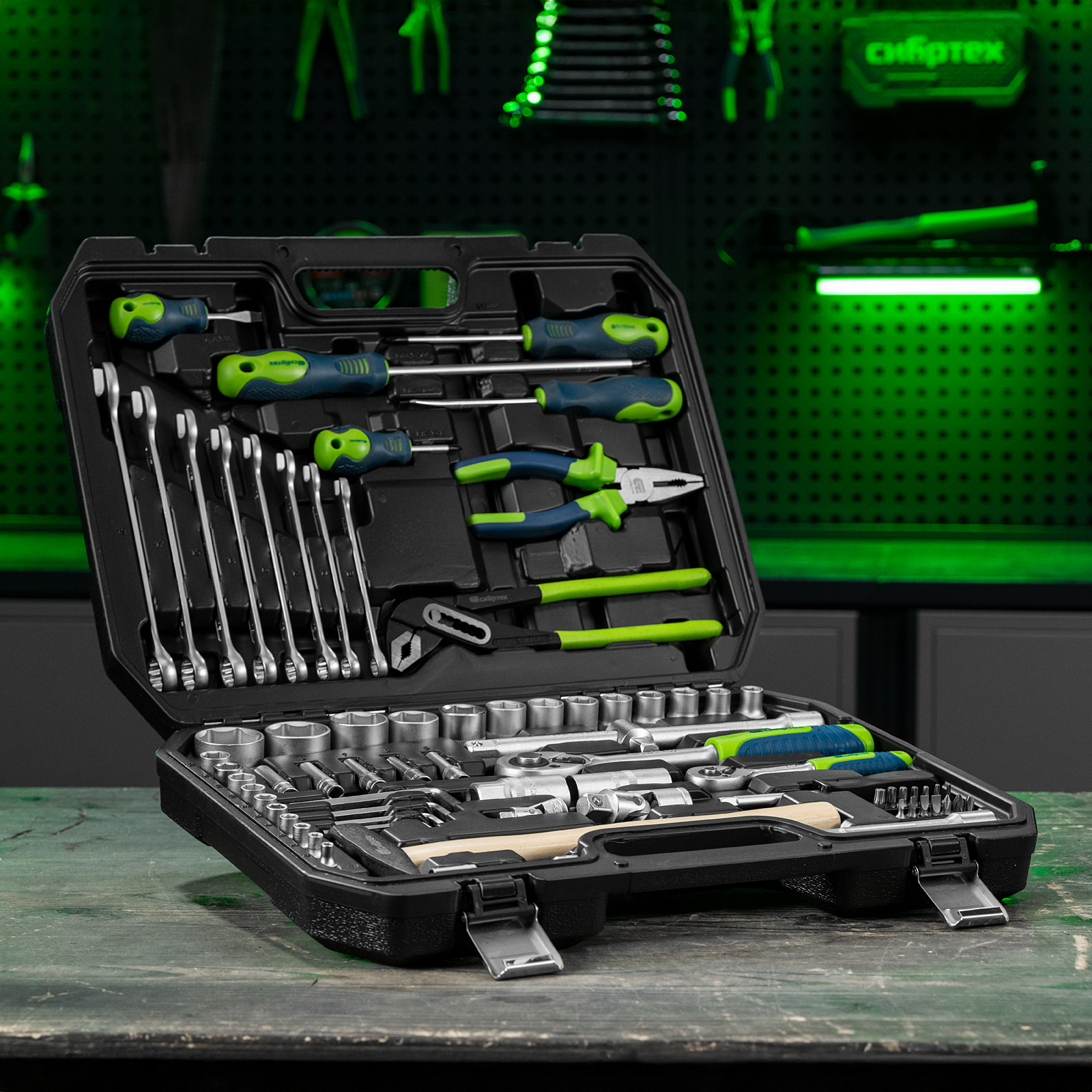 Набор инструментов Сибртех 13394 упакован в пластиковый кейс и состоит из 76 предметов с присоединительным размером 1/2" и 1/4", предназначенных для монтажа и демонтажа резьбового крепежа с разными типами шлицев, а также для ударных и других слесарно-монтажных работ. В комплект поставки входят карданы, удлинители и переходники, облегчающие работу в труднодоступных местах. Набор используется для ремонта автомобилей, а также полезен в быту.
