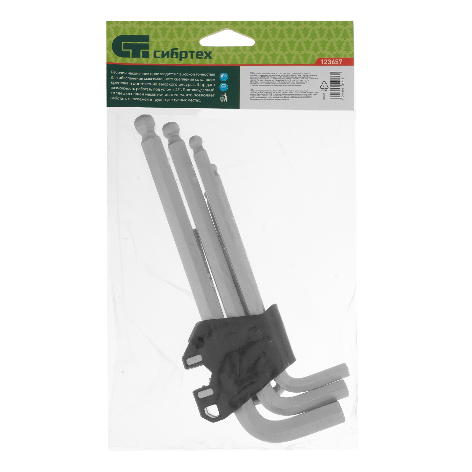 Набор Сибртех 123657 включает в себя 9 удлиненных имбусовых ключей из стали CrV размером 2-12 мм, с шаром, предназначенных для закручивания и откручивания крепежа со шлицем типа HEX. Шарообразные наконечники можно вставлять в головку крепежа под углом до 25°, удлиненные профили позволяют увеличить прикладываемое усилие. Набор пригодится для ремонта велосипедов, сборки мебели, установки и регулировки пластиковых окон.