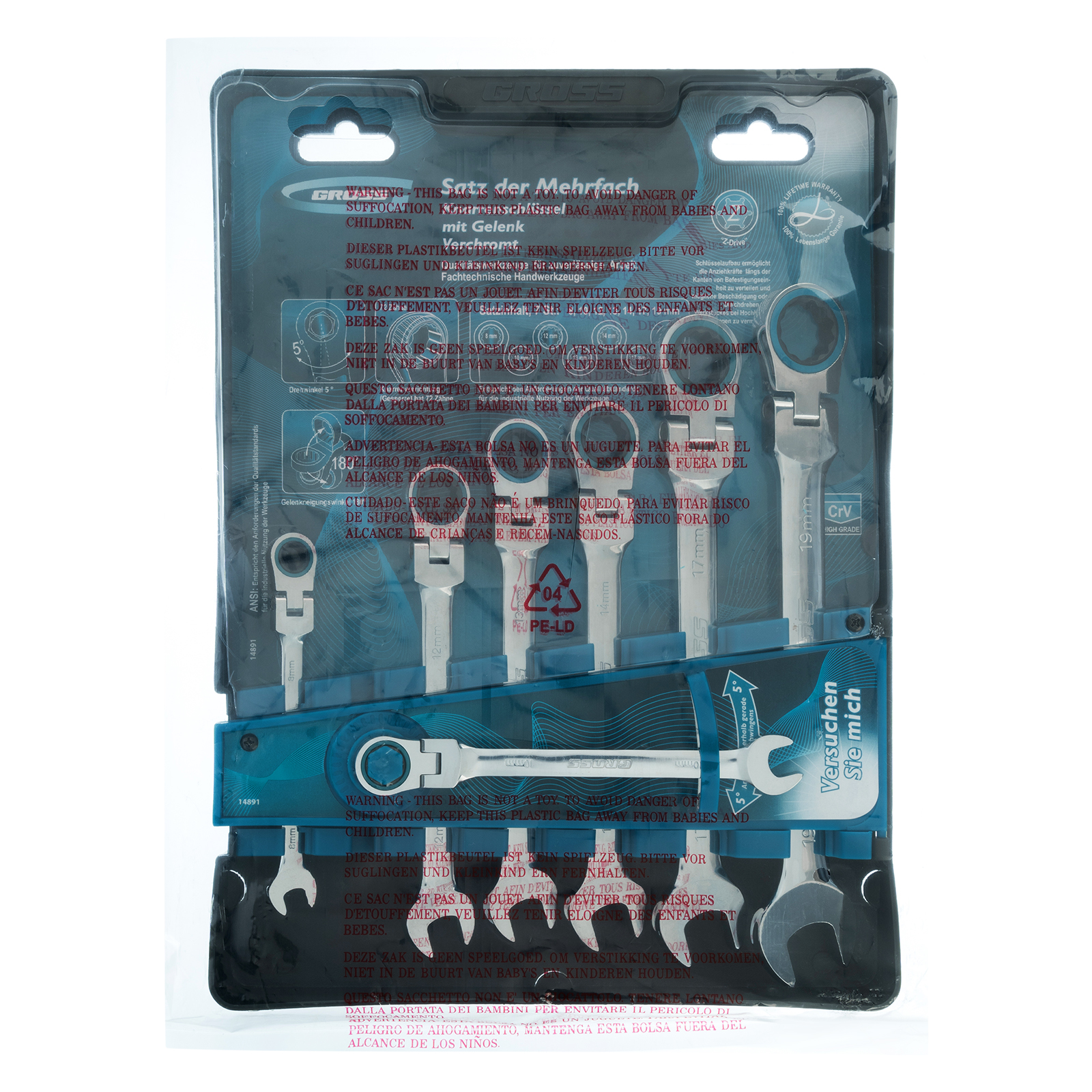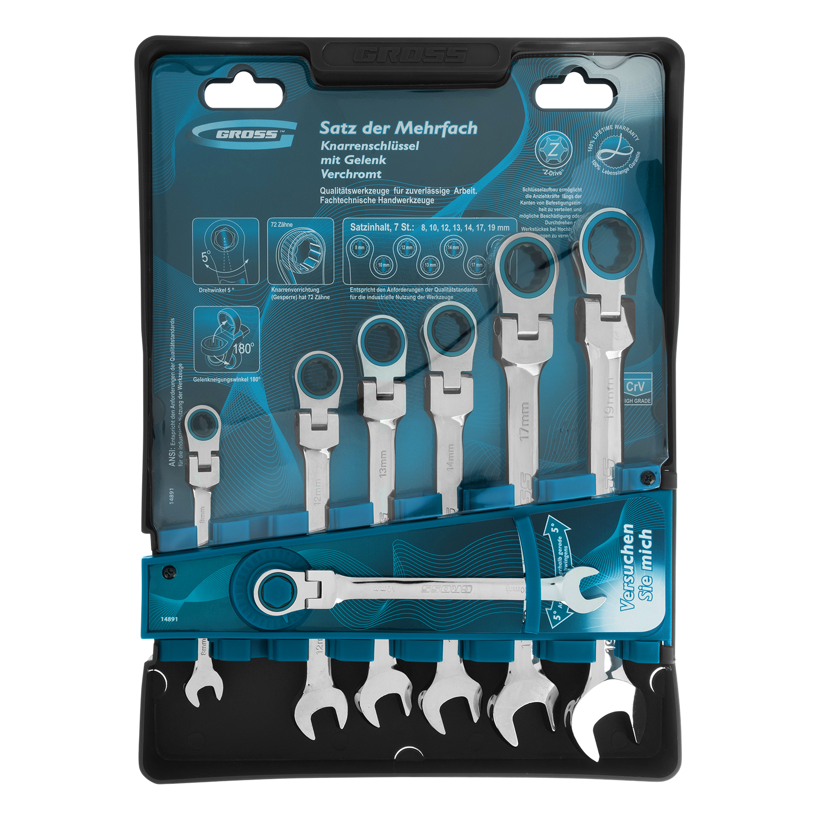 Набор ключей комбинированных с трещоткой, 8-19 мм, 7 шт, шарнирные, CrV Gross