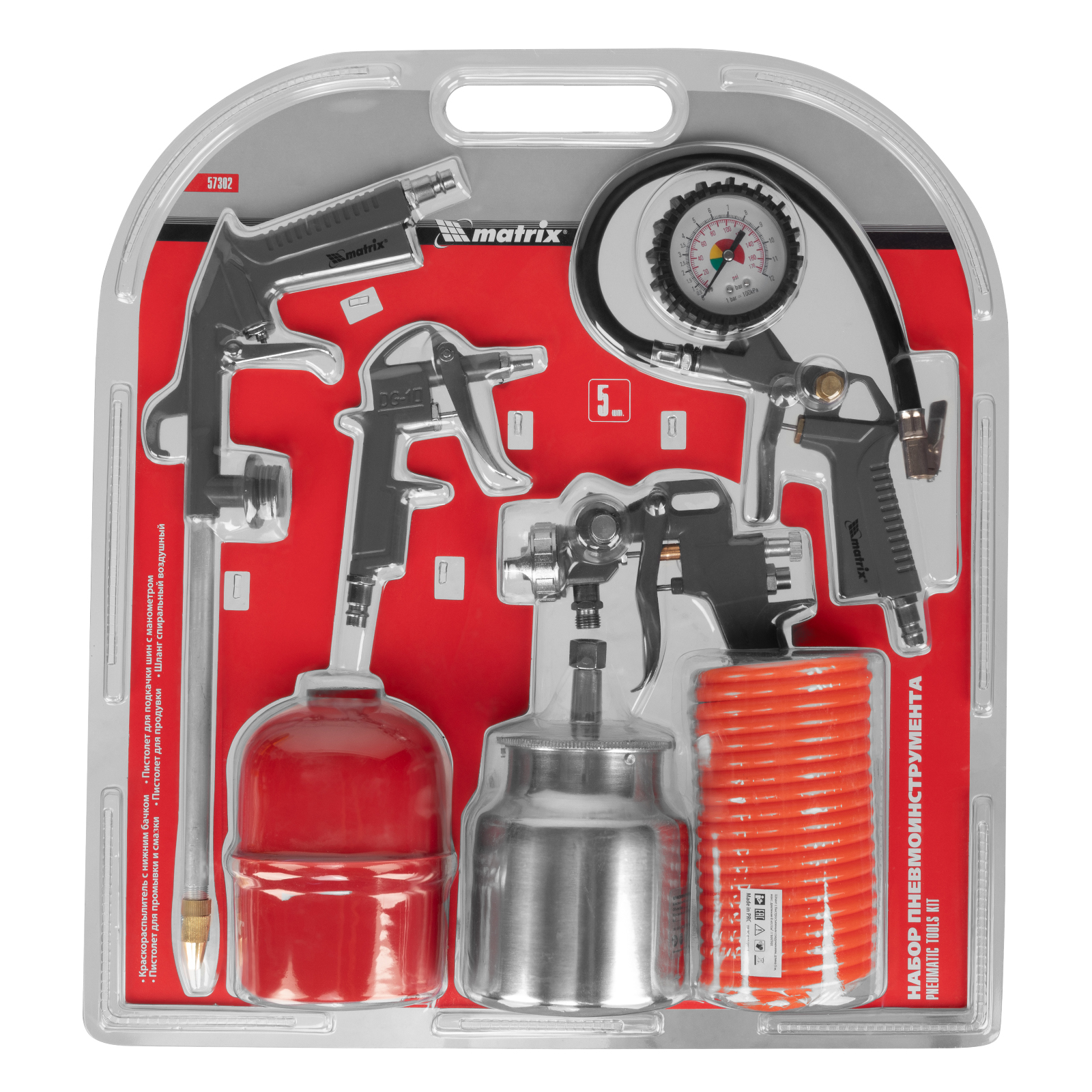 Набор пневмоинструмента Matrix 57302 включает 5 предметов: промывочный пистолет, продувочный пистолет, пневмопистолет для накачки шин, краскораспылитель с нижним бачком и шланг с быстросъемным соединением. Пневмоинструменты совместимы со всеми типами компрессоров. Набор пригодится в автомастерской, на мебельном производстве, в гараже или при проведении ремонта.,С помощью краскораспылителя можно покрасить деревянные, пластиковые или металлические поверхности. Промывочный пистолет предназначен для очистки деталей и инструмента, а также смазки различных поверхностей. Пистолет для подкачки шин позволяет измерить давление в шине и накачать ее. Продувочный пистолет очищает поверхности и детали струей сжатого воздуха, а спиральный шланг служит для подключения пневмоинструмента к компрессору при помощи быстросъемного коннектора.