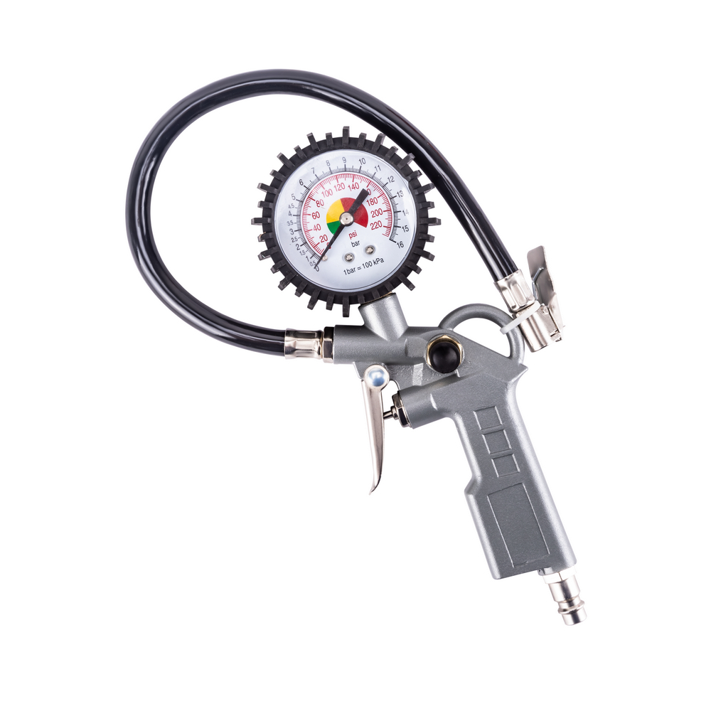 4. Пистолет для подкачки шин с манометром 60 мм - материал корпуса алюминий, шланг с прищепкой 30 см, макс. давление 12 бар, cоединение Rapid M ("папа")