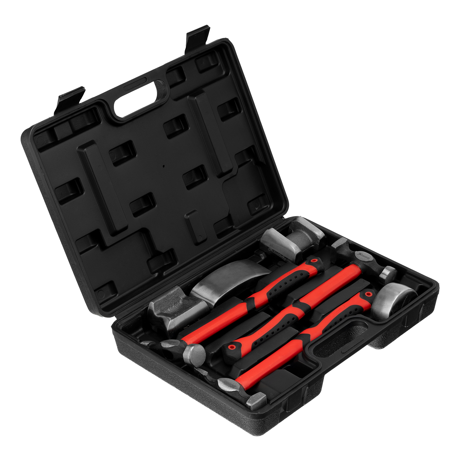 Рихтовочный набор Matrix 10845, включающий 3 молотка с фибергласовыми ручками и 4 наковальни, предназначен для исправления геометрии элементов автомобильного кузова. Наковальни и ударные головки имеют различную форму, что позволяет работать с деталями разной степени кривизны. Набор используется в автомастерских.