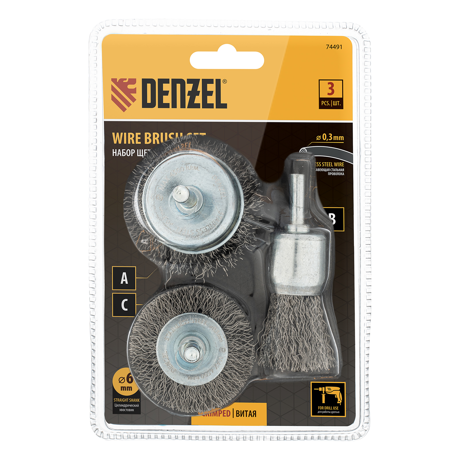 Набор щеток для дрели, 1 Плоская 50мм, 2 Чашки 25-50мм, шпилька, нерж. вит. проволока Denzel в Казани
