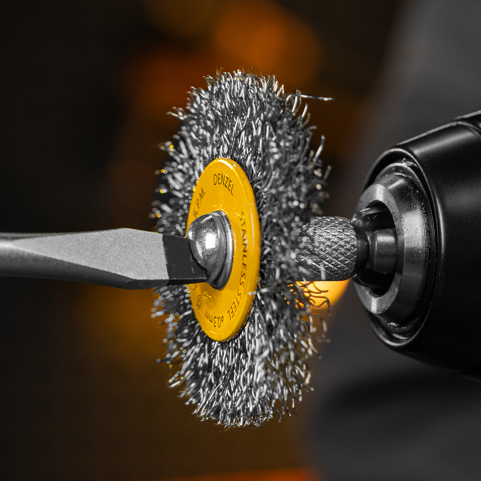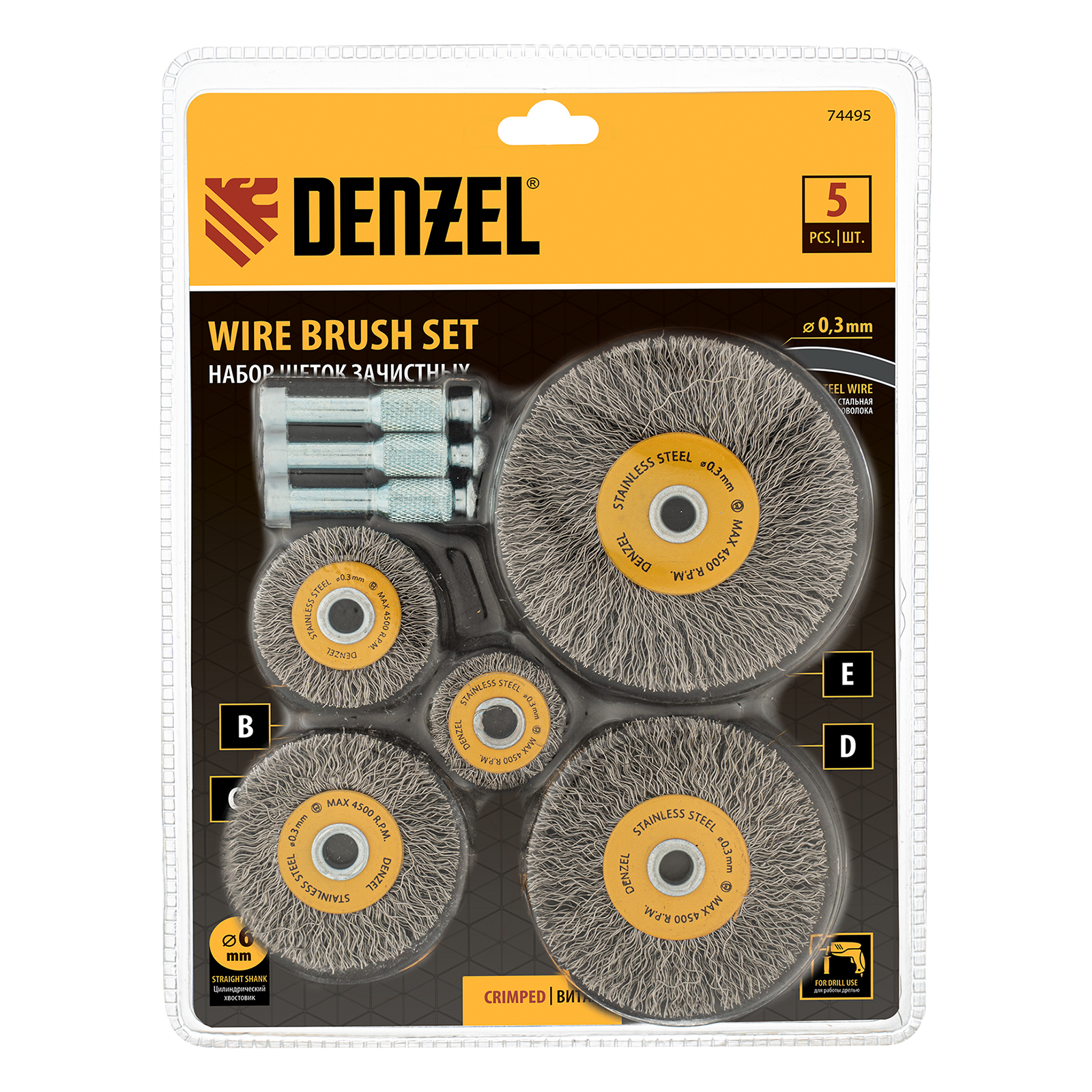 Набор щеток для дрели, 5 Плоских 25-38-50-63-75 мм, шпилька, нерж. вит. проволока Denzel в Казани