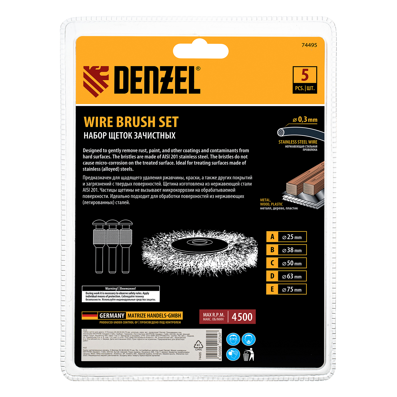 Набор щеток для дрели Denzel 74495 со шпилькой и щетиной из нержавеющей витой проволоки включает в себя 5 плоских щеток диаметром 25-38-50-63-75 мм. Набор используется для щадящей обработки твердых поверхностей: металла, стали (в том числе нержавеющей), древесины, пластика, позволяет удалять старые лакокрасочные покрытия, ржавчину и загрязнения. Плоская насадка удобна для зачистки пазов, изгибов и углов.
