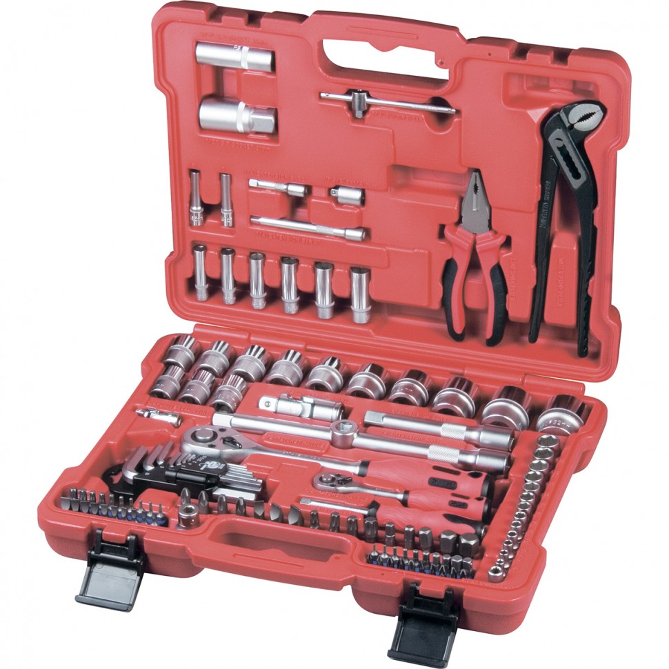 Слесарно-монтажный набор Matrix 13587 с присоединительными квадратами 1/4", 1/2" и 5/16" состоит из 117 предметов и используется для монтажа и демонтажа резьбовых соединений. Включает карданные шарниры, упрощающие работу с труднодоступным крепежом, а также пассатижи и переставные клещи для удержания деталей. Инструменты будут полезны в авторемонтной мастерской, пригодятся также и в быту.