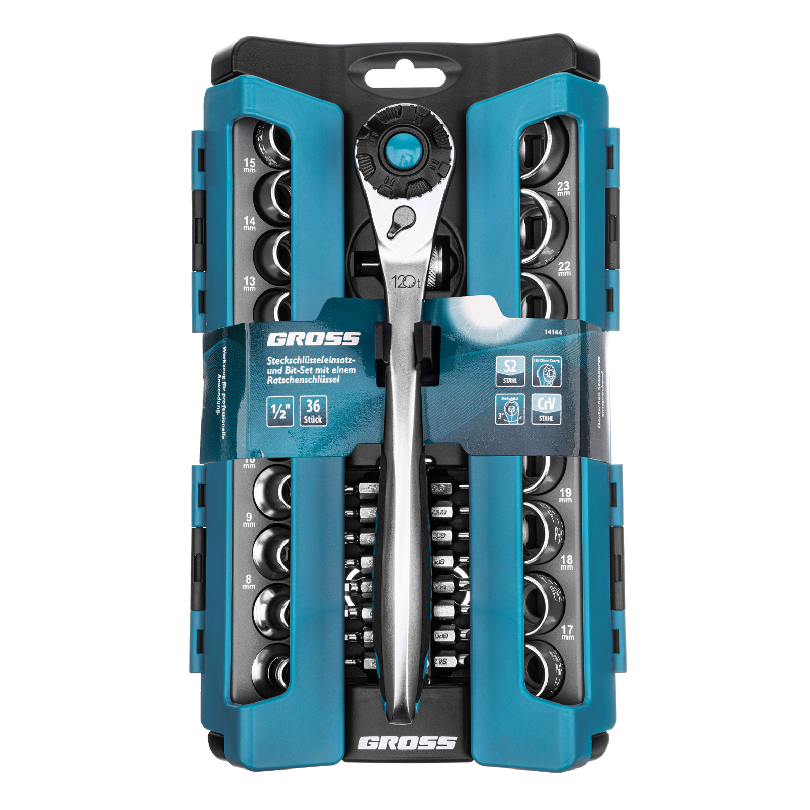 Набор торцевых головок, трещотка 120 зубьев, 1/2", CrV, 36 предметов Gross