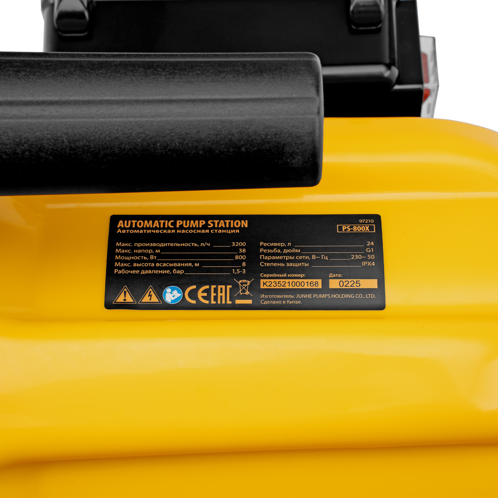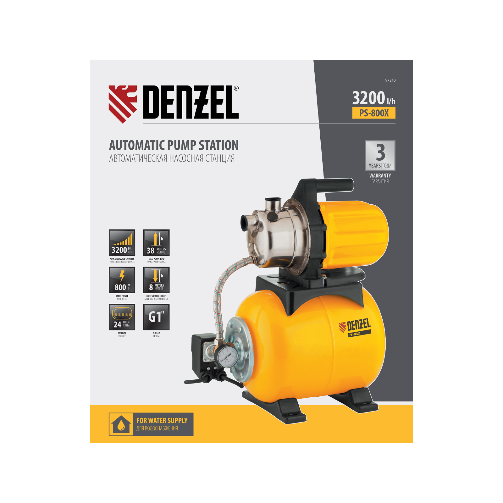 Насосная станция PS800X, 800 Вт, 3200 л/ч, ресивер 24 л, подъем 38 м, нержавейка Denzel