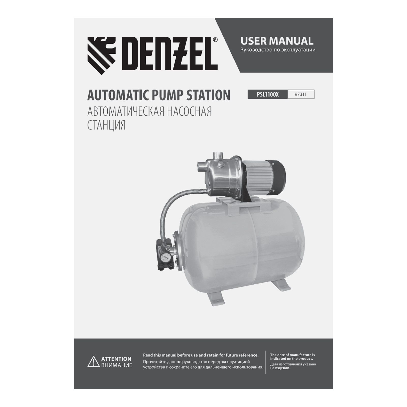 Насосная станция PSL1100X, 1100 Вт, 3600 л/ч, ресивер 50 л, подъем 45 м, нержавейка Denzel