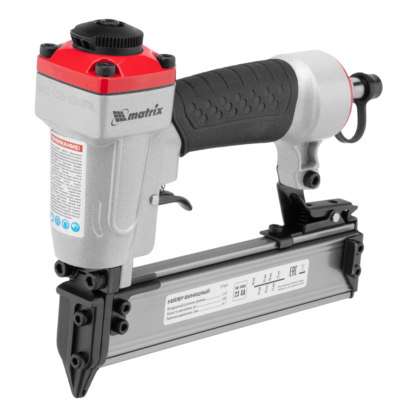 Пневматический финишный нейлер Matrix 57425 (шпилькозабивной пистолет) предназначен для забивания гвоздей 23GA диаметром 0,64 мм и длиной 10-30 мм. Он используется для финишной отделки, а также сборки мебели и производства упаковки. Благодаря низкому расходу воздуха 0,7 л/мин нейлер совместим с любым типом компрессоров.