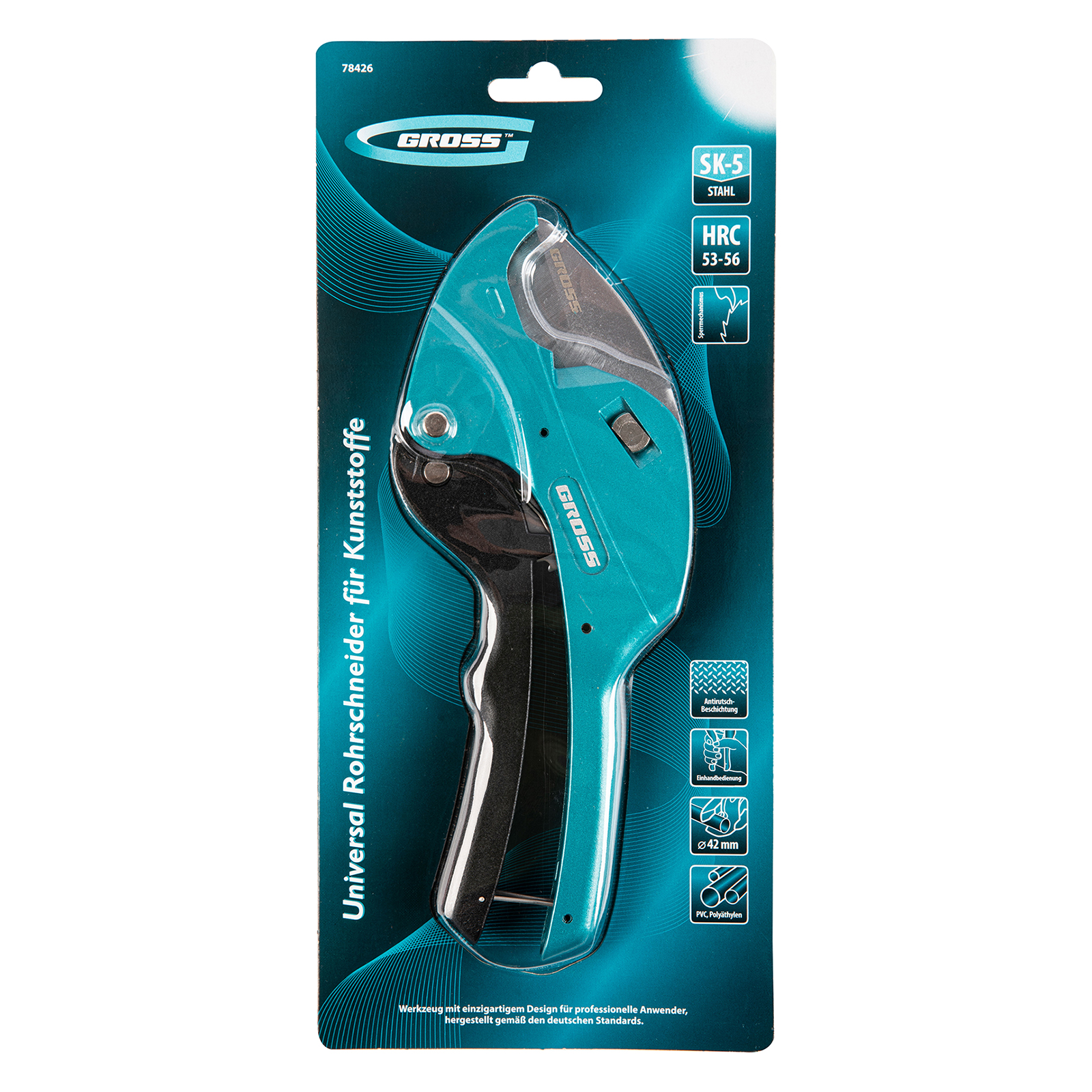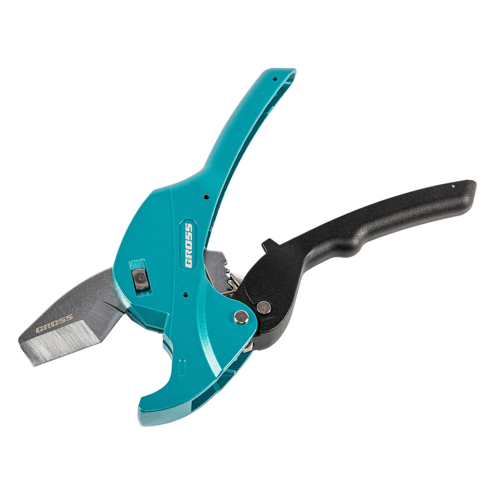 Универсальные ножницы для резки изделий из ПВХ Gross 78425 применяются для работы с пластиковыми трубами диаметром до 32 мм, а также для разрезания профилей, плинтусов, галтелей, реек, планок, резиновых шлангов и других предметов. Прямой нож инструмента позволяет резать плоские заготовки. Ножницы пригодятся для выполнения сантехнических и отделочных работ.