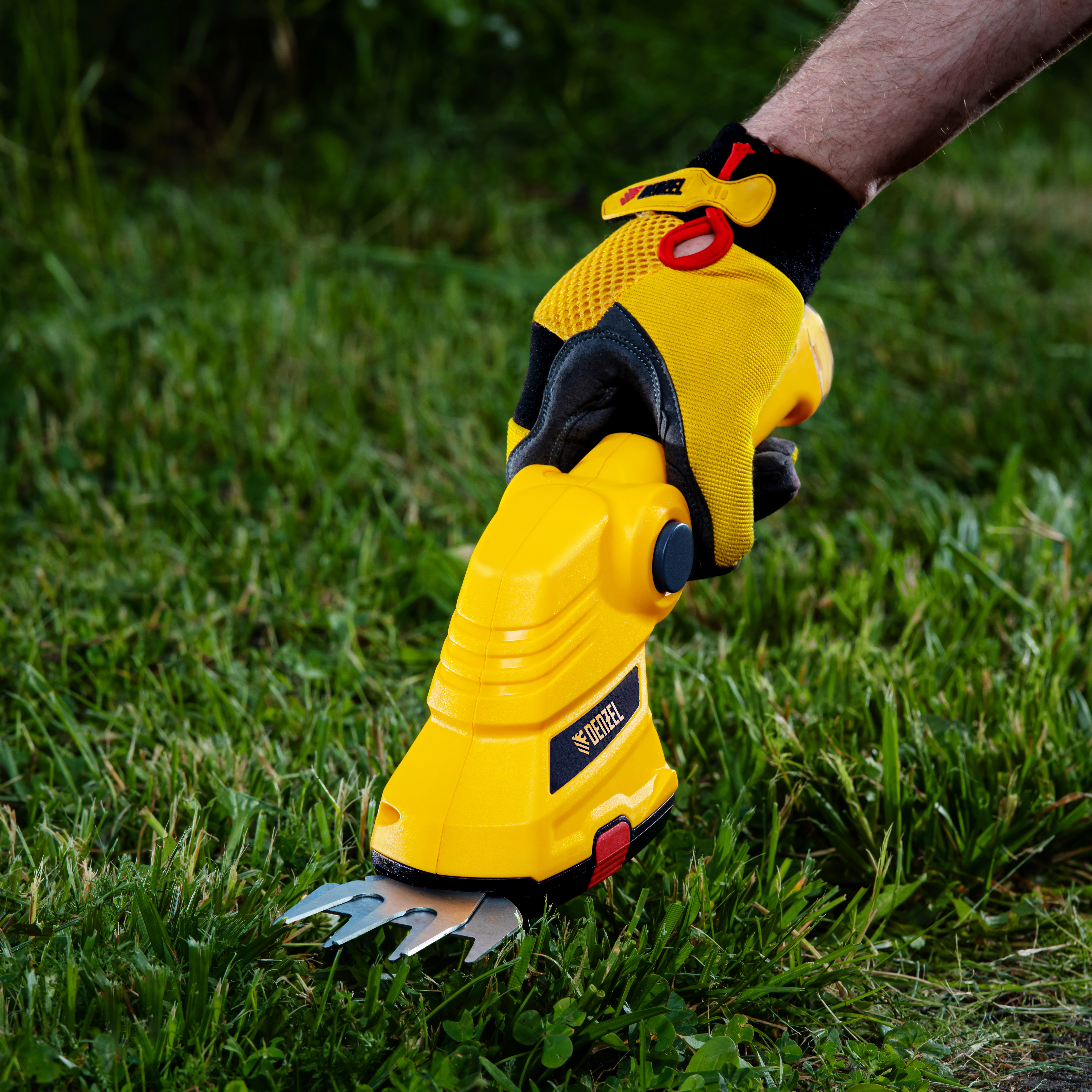 Аккумуляторные ножницы-кусторез Denzel G411 96817 с Li-Ion батареей напряжением 3,6 В и емкостью 1,5 Ач предназначены для поддержания декоративной растительности на дачном участке в аккуратном виде. В комплект входят две оснастки: для подрезания газонной травы и для обрезки кустов и тонких веток деревьев. Благодаря простому управлению и малому весу 0,6 кг с ножницами-кусторезами легко справятся даже пожилые люди.